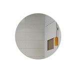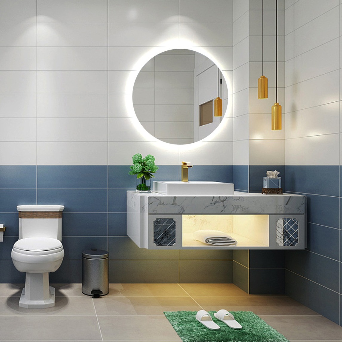 现代混搭卫生间,比较大的空间。光线比较充裕,圆形的背光灯镜,吊灯在其上,还有孔灯也有。壁挂式的浴室柜,大理石平台的,其上是一个金色水龙头,更显现代奢华感。边上有个金属脚踩垃圾桶。整体算是现代奢华风吧!