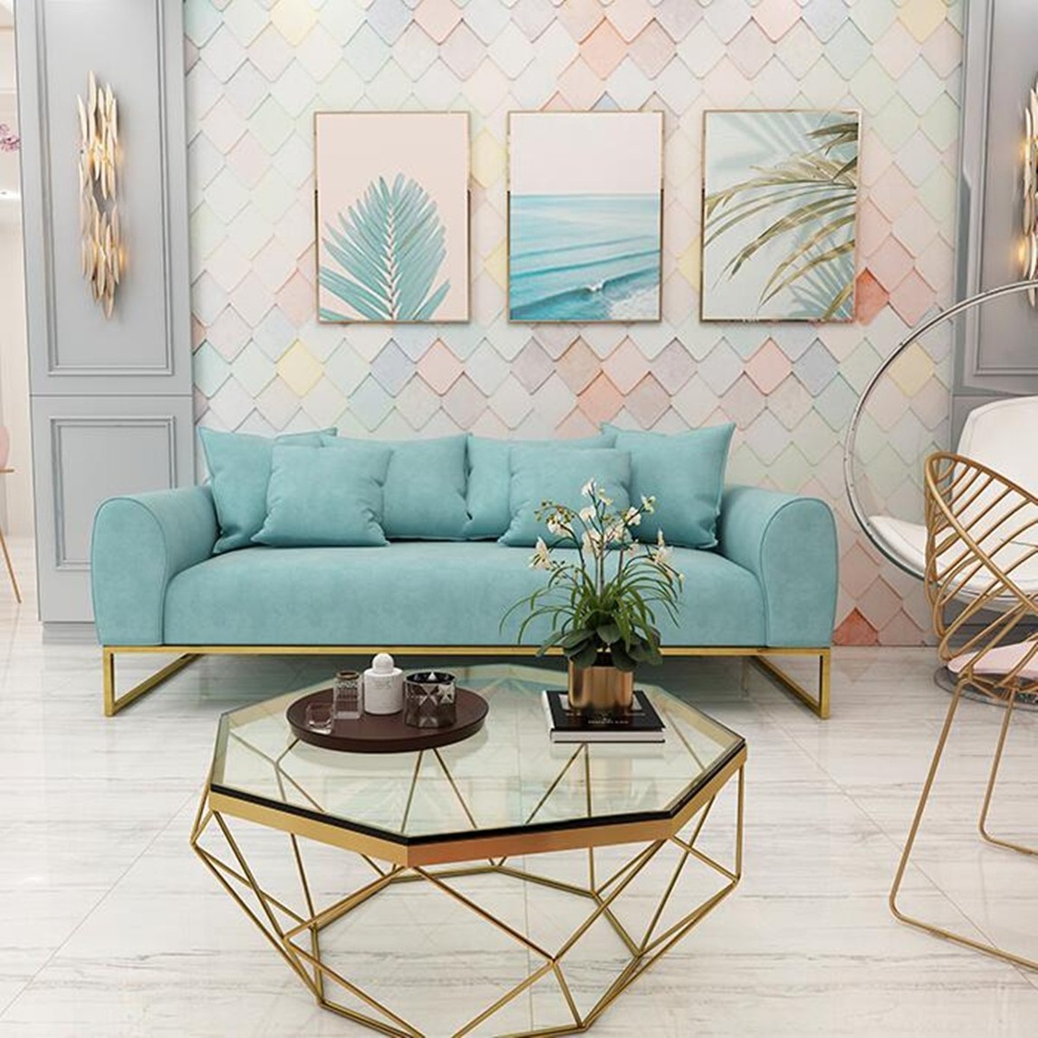 蓝色调的北欧风,最显清新自然之感,沙发和装饰画色调很统一,铁艺的家具来增添层次感和设计感,客厅空间显得很大。