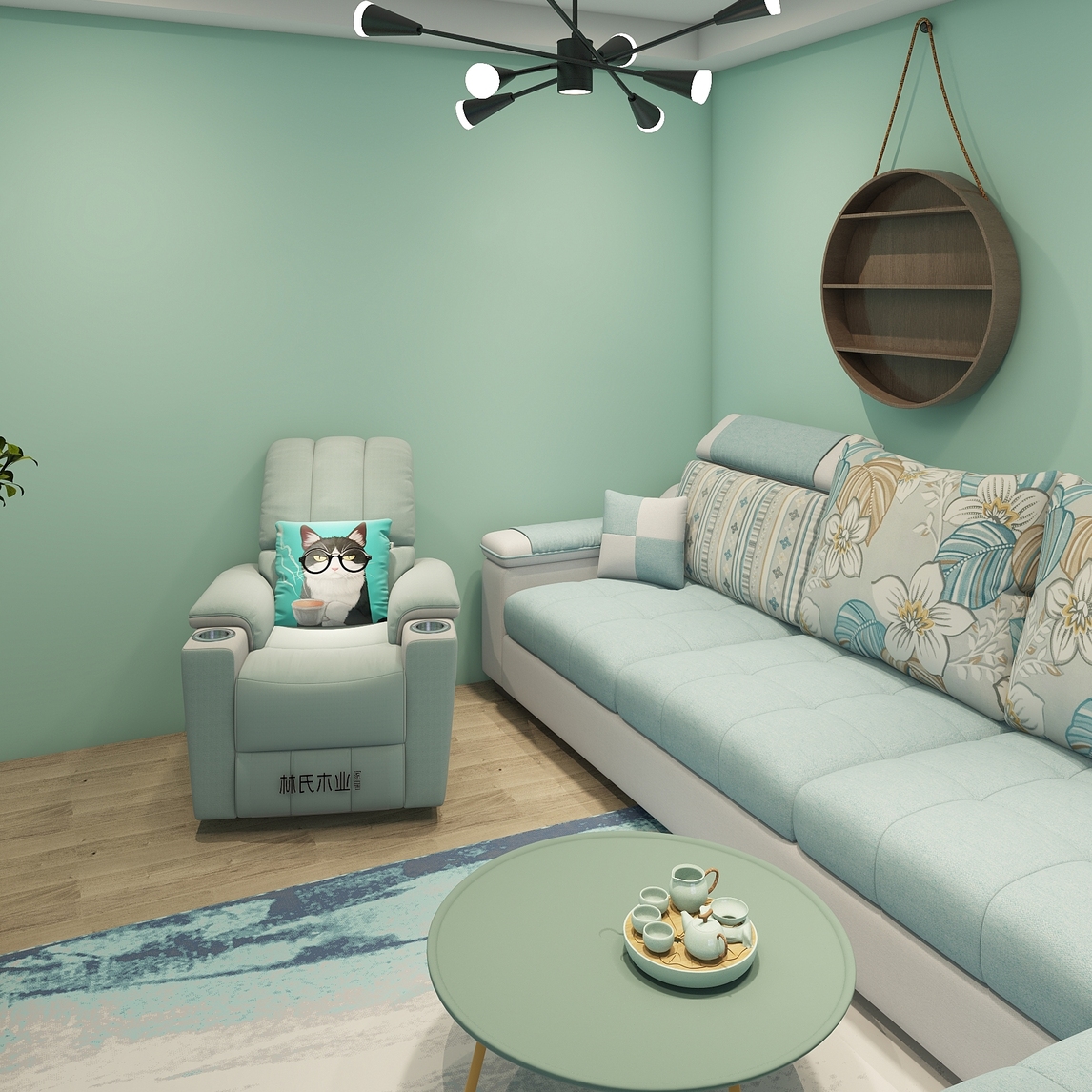 整体风格取材自地中海腹地民居装修特色,黑白色小吊灯,沙发,沙发椅,小茶几均采用海蓝色,烘托环境简约而不失奢华,实木地板非常实用,墙面采用立邦竹炭乳胶漆,净味环保,无甲醛困扰,是个会客的好地方!