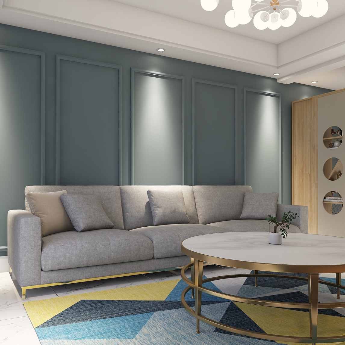 不需要多余的装饰来点缀,硬装方面也选择了简洁大方的白色地砖,以及灰色墙漆,形成强烈的对比度。整体全靠软装来协调,电视墙采用大理石瓷砖更显低调。整体适合年轻业主