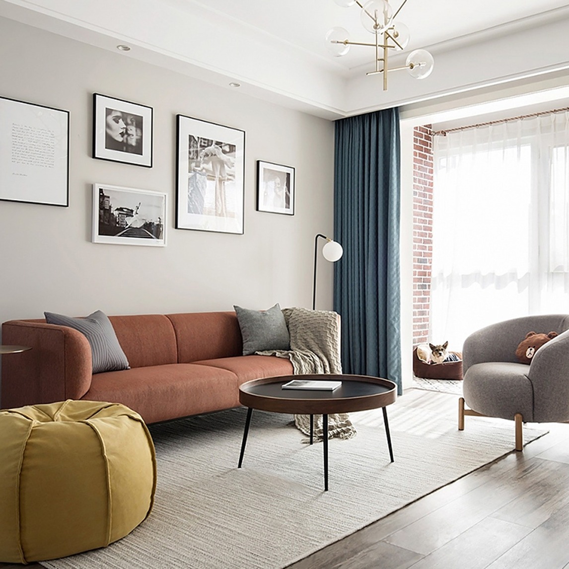 客厅作为居家待客的一个重要空间,值得多花心思去布置,轻装修重装饰,软装搭配是营造空间氛围的主要搭配,以灰色调打底,蓝色的窗帘配桔红的沙发,再过渡一个黄色的豆袋,色彩鲜明又不突兀。很是耐看。