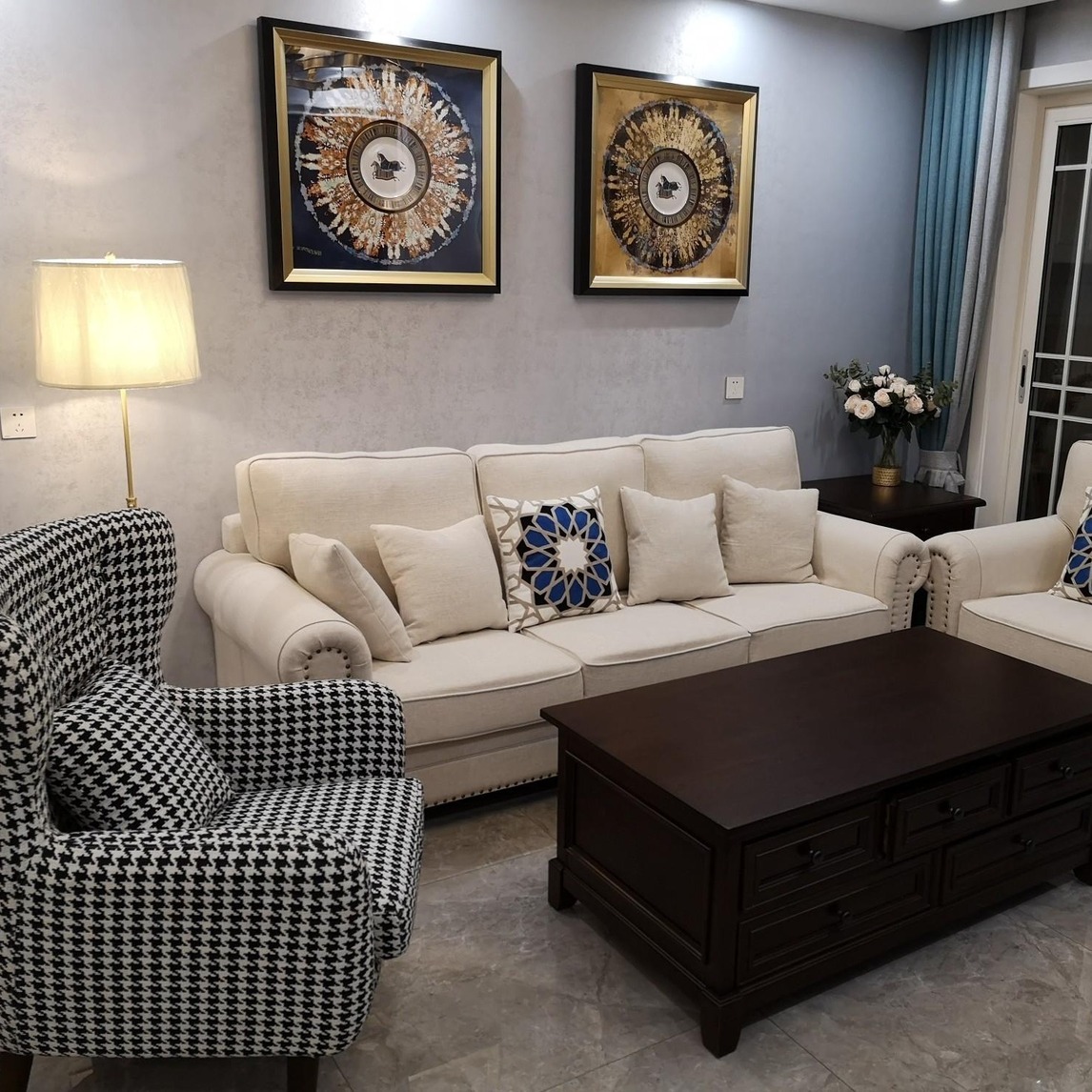 这个125㎡的家里,没有国内美式常见的深色与大体量,摒弃浮夸奢华,依旧充满着温暖的日常气息。 墙面上极具设计感的挂画、深咖色边几上的插花摆件,利用软装的丰富性,饱满了客厅区域的视觉效果。 米白色的三人...展开