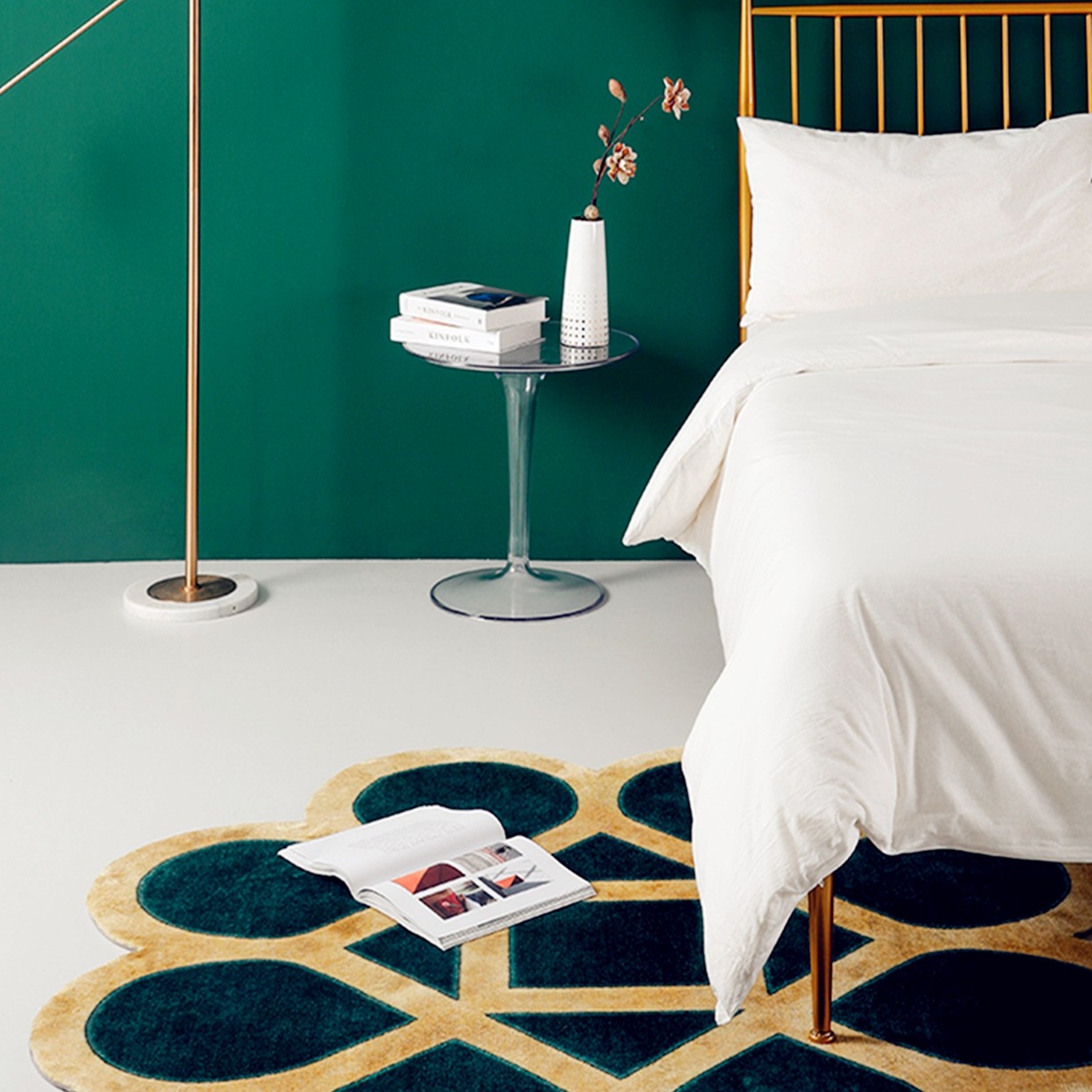 我想这个图里最吸睛的就是那块美美哒,像是花开一样的地毯。整个空间里,都不需要过多繁复的家具或是装饰,一张金色的铁艺的双人床,满满的复古味道,配着纯白色的床品,床边一块宝石绿的地毯,还有金色的花边点缀,...展开