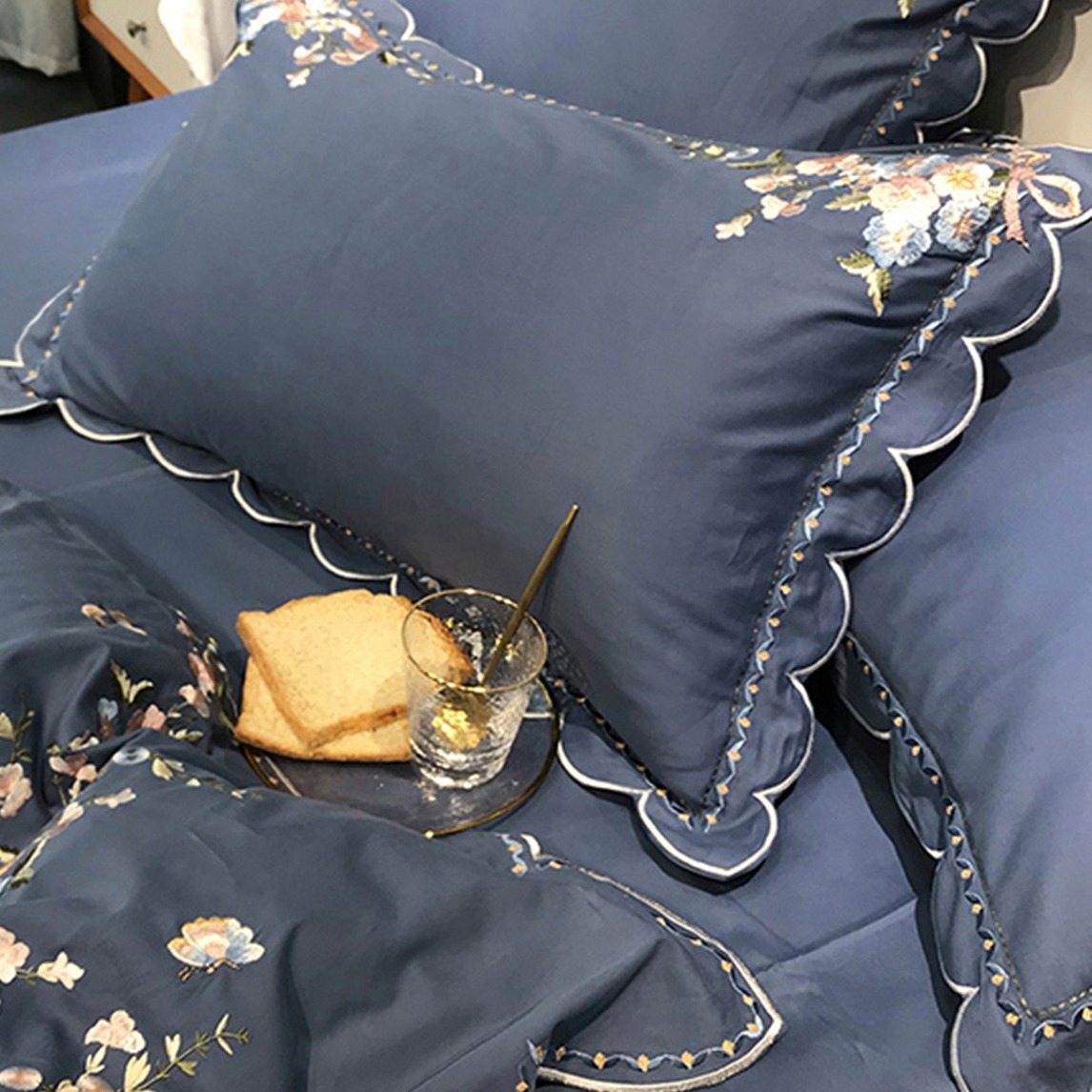 幽静的蓝色四件套,60支贡缎轻磨毛材质,搭配精致的植物刺绣,显得雍雍华贵,就连简单的玻璃杯,也是奢华的金边造型,每一个细节都彰显出卧室的高档。