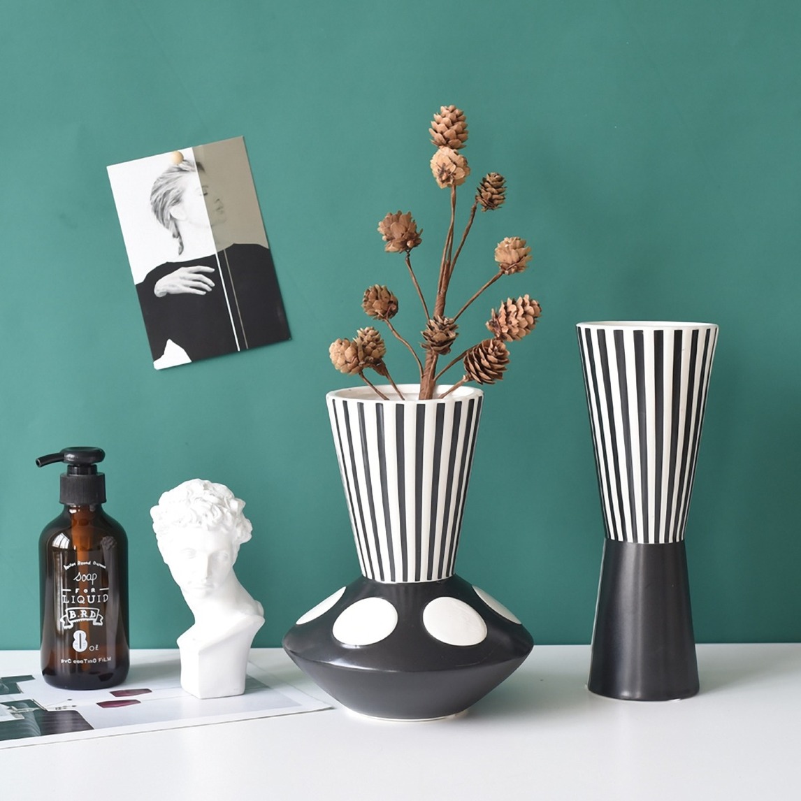 北欧风混搭现代抽象,陶瓷花瓶结合现代抽象与写实的手法,用黑白几何元素展现时尚与艺术,整体空间既简洁又优雅。