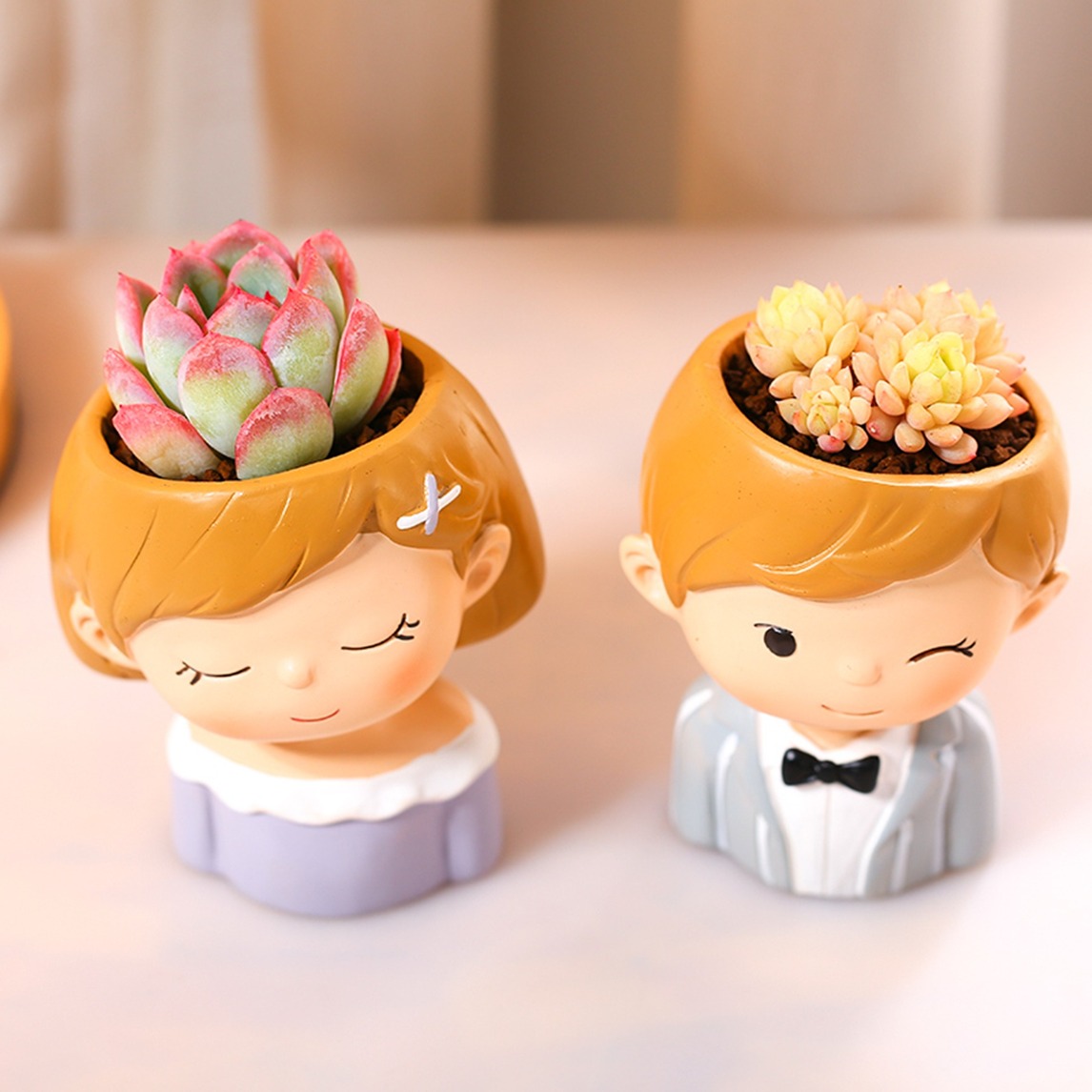选用一对卡通情侣花盆用来养植肉肉是再好不过的了,萌萌的男女卡通造型搭配上肉肉,不仅造型萌新,还是秀恩爱的利器,摆在办公桌或是书桌上,非常有爱哦!
