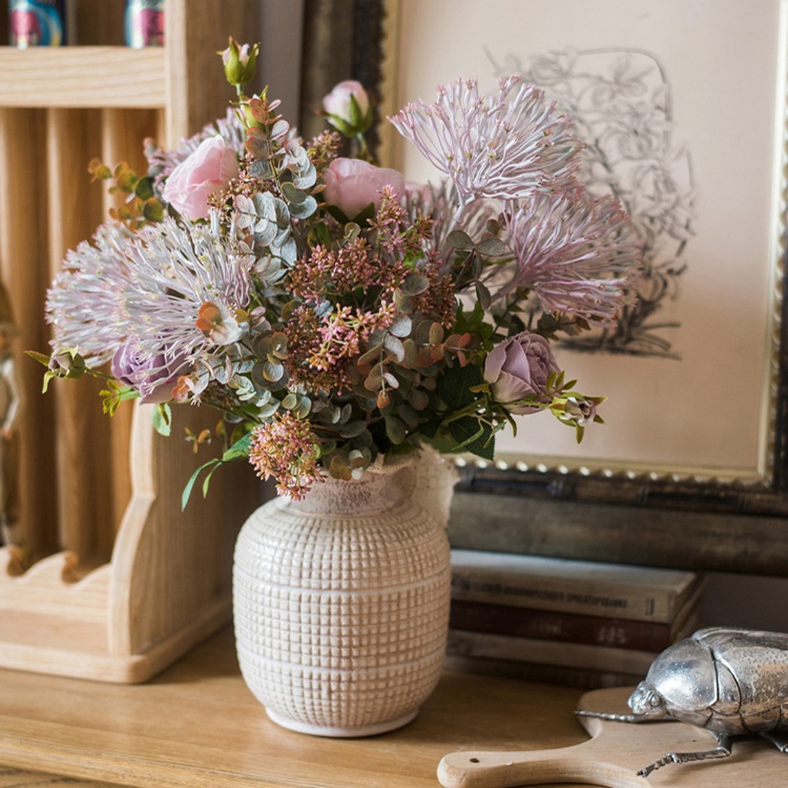 美式乡村的魅力在于它的野趣与自然,这样的风格与现代快节奏其实非常匹配,一束简单的设计师花束,一个复古的素纹粗陶花瓶,再加上个性的金属甲虫装饰,简简单单的摆放在餐厅的一角,却时刻散发着自然的魅力。