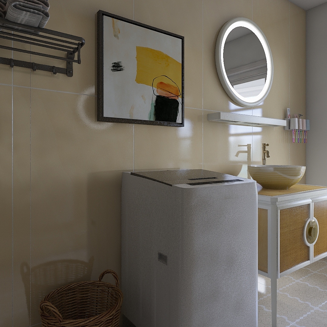 作为备用洗手间,只需要放置洗衣机和洗手台,窄小也没问题,量好宽度和装修硬件宽度,只需留有一人走路的空间即可。黄色的背景装饰上挂画亮眼年轻哦!