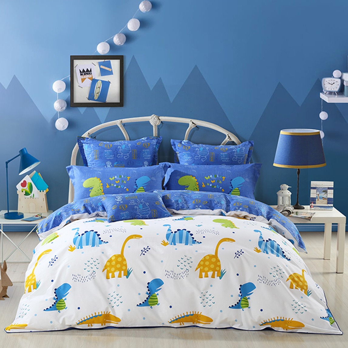 可爱的卡通恐龙造型点缀在床品上,萌趣可爱,深受男孩子的喜爱。选用40S全棉面料制作而成,搭配上活性印染工艺,面料手感柔软亲肤,给宝宝带来甜美健康的睡眠享受。
