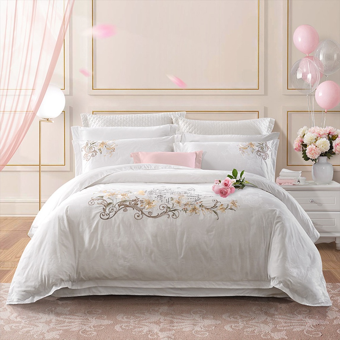 卧室是我们每天睡觉的地方,床品当然不能太将就,对于我这种品质控来说,特别喜欢这种提花刺绣的四件套。被面上的刺绣很精美,百合花也是我喜欢的花,西式的风格,看上去很唯美浪漫。