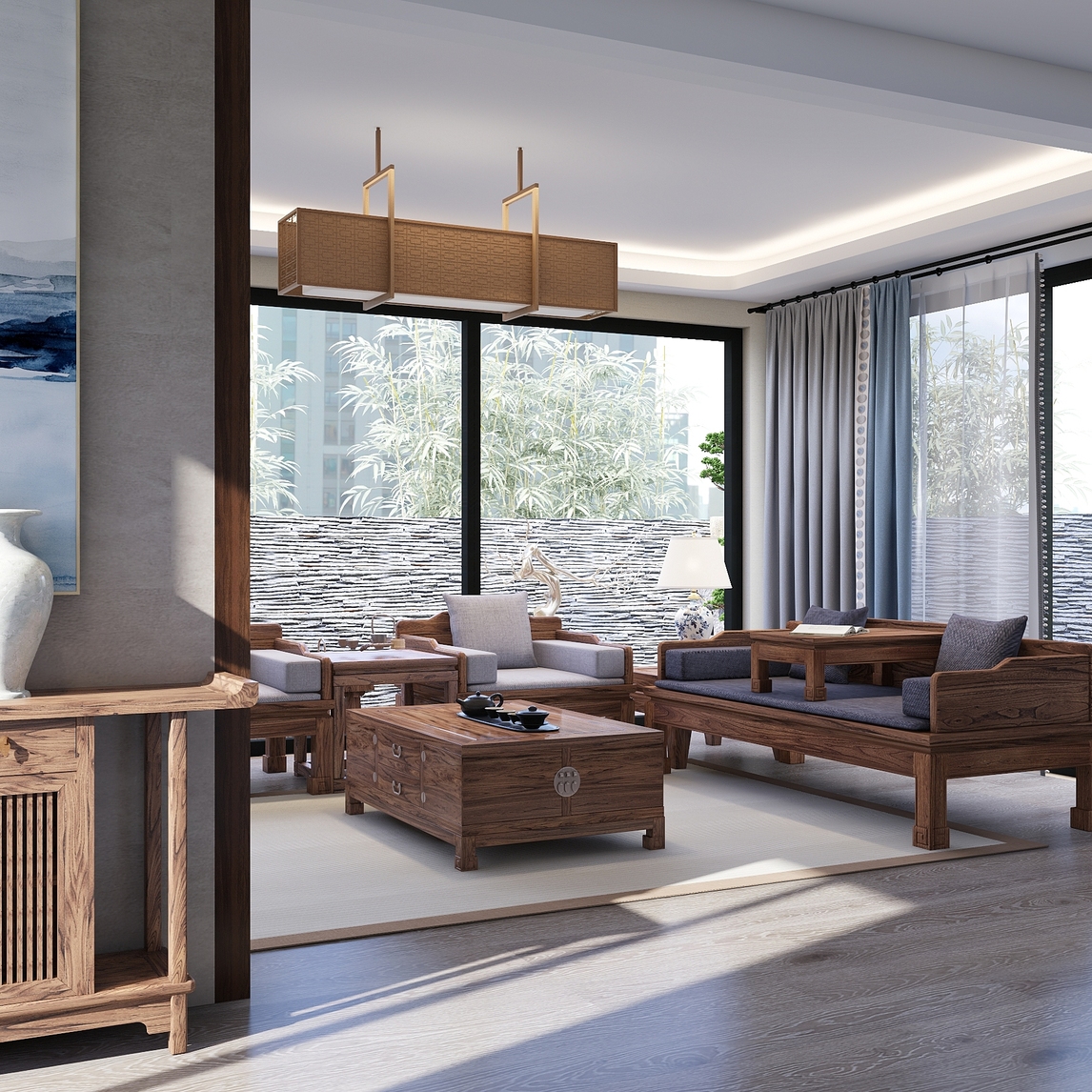 两面大落地窗,窗外植竹,在城市中也能感受自然的轻松自在。古朴禅意的罗汉床让人暂时忘却快节奏的生活,满满享受自然的中式的慢生活。