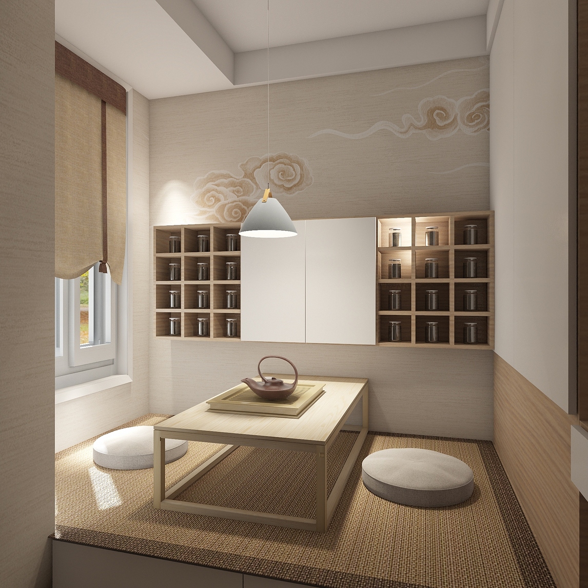 将书房改造成了榻榻米的空间,合理的利用空间打造不同的柜体,墙体的陈列柜,可以储放很多的茶叶展示。业主是喜欢喝茶之人,这也可以让他更好的享受生活的闲情雅致。
