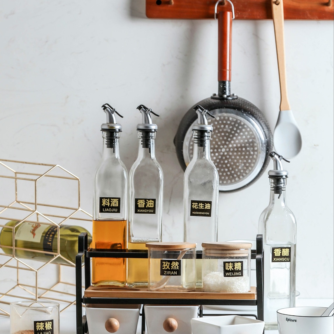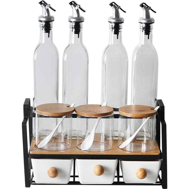 黑色铁艺置物架,搭配竹片分层,简洁大方,玻璃油瓶中,各类油色一目了然,按压式壶嘴,轻松开盖不挂油,抽屉式调味盒,拿取方便,用上这样的调味罐套装,厨房干净、整洁,做饭更方便~