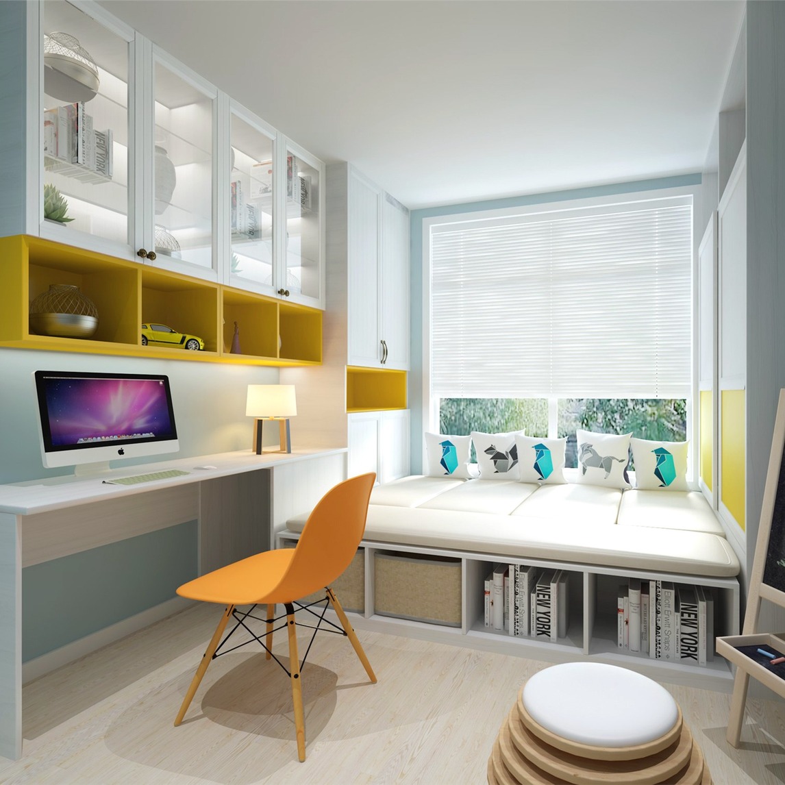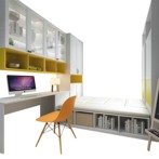 米白樱桃木纹搭配黄色牛仔布纹,在安静中融入活泼的元素,整个空间更加清新自然,活泼靓丽;小而精致,功能丰富:储物、休息、工作功能多样,书房、客房空间任意切换。