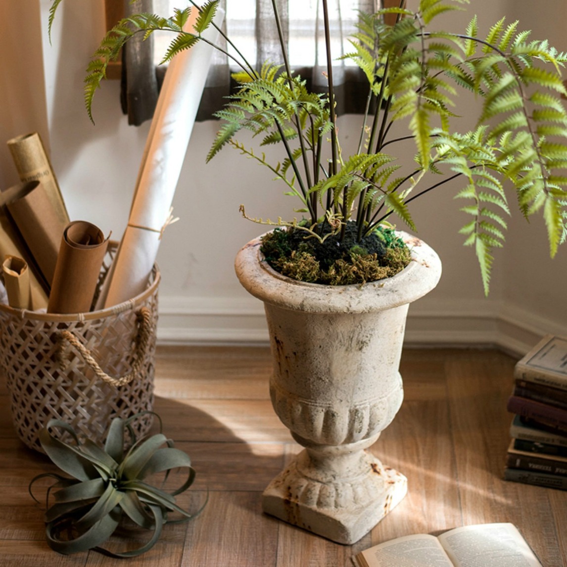 喜欢这种带有小情趣的趣味装扮,在阳台的一角,打造属于自己的乐园,复古怀旧的罗马柱,清新的草木绿,有着怀旧质感的镂空竹片收纳,一些书籍,一些花卷,我敢说,这样的阳台,我可以暂时忘记手机的存在。