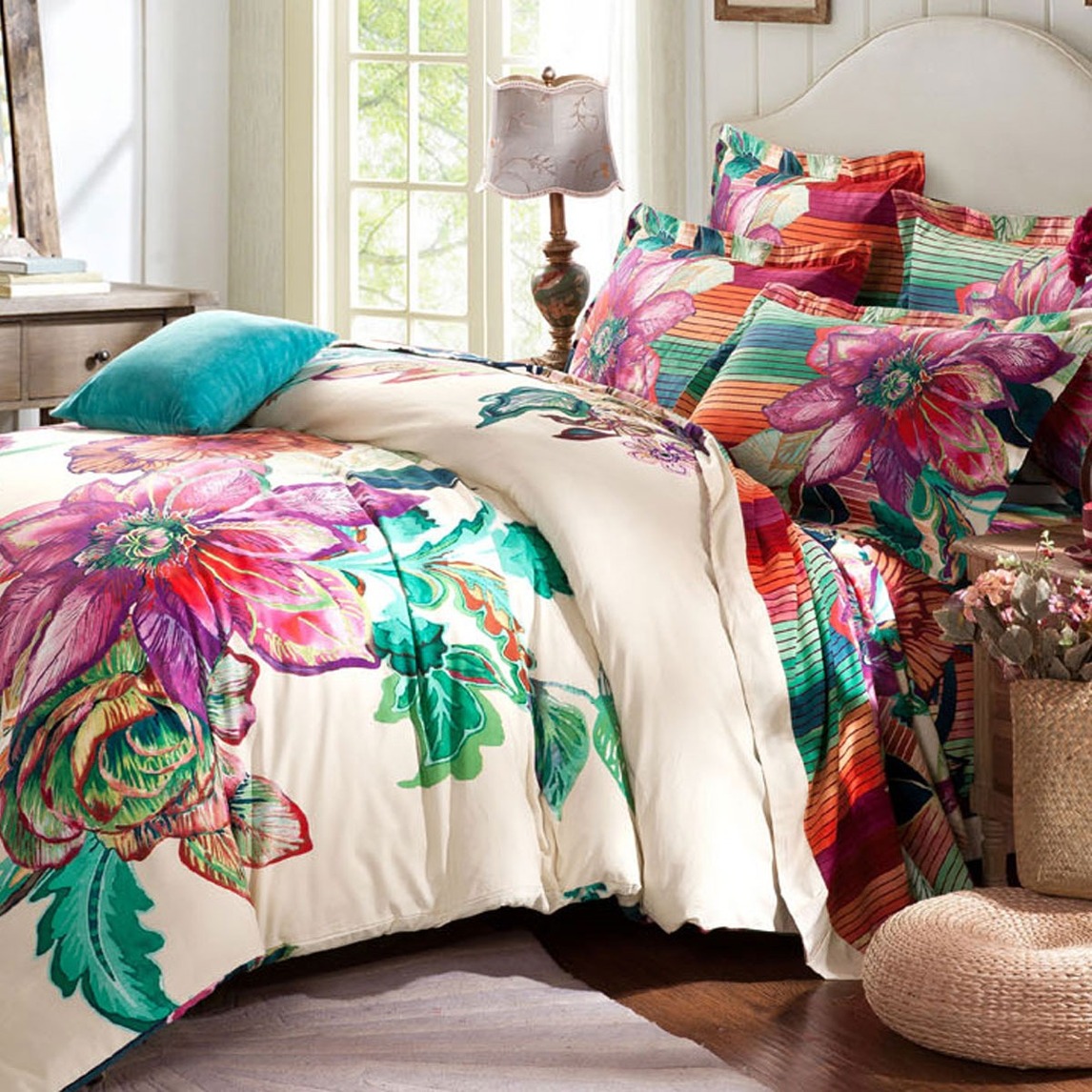 卧室的装饰一直大家都比较重视,更多的时候都希望比较有新意。那么这床夸张的四件套铺在床上,瞬间卧室都变得特别的有新意,艳丽的花朵,大面积的覆盖在被面上,躺在里面就像在万花从中一样,多好。