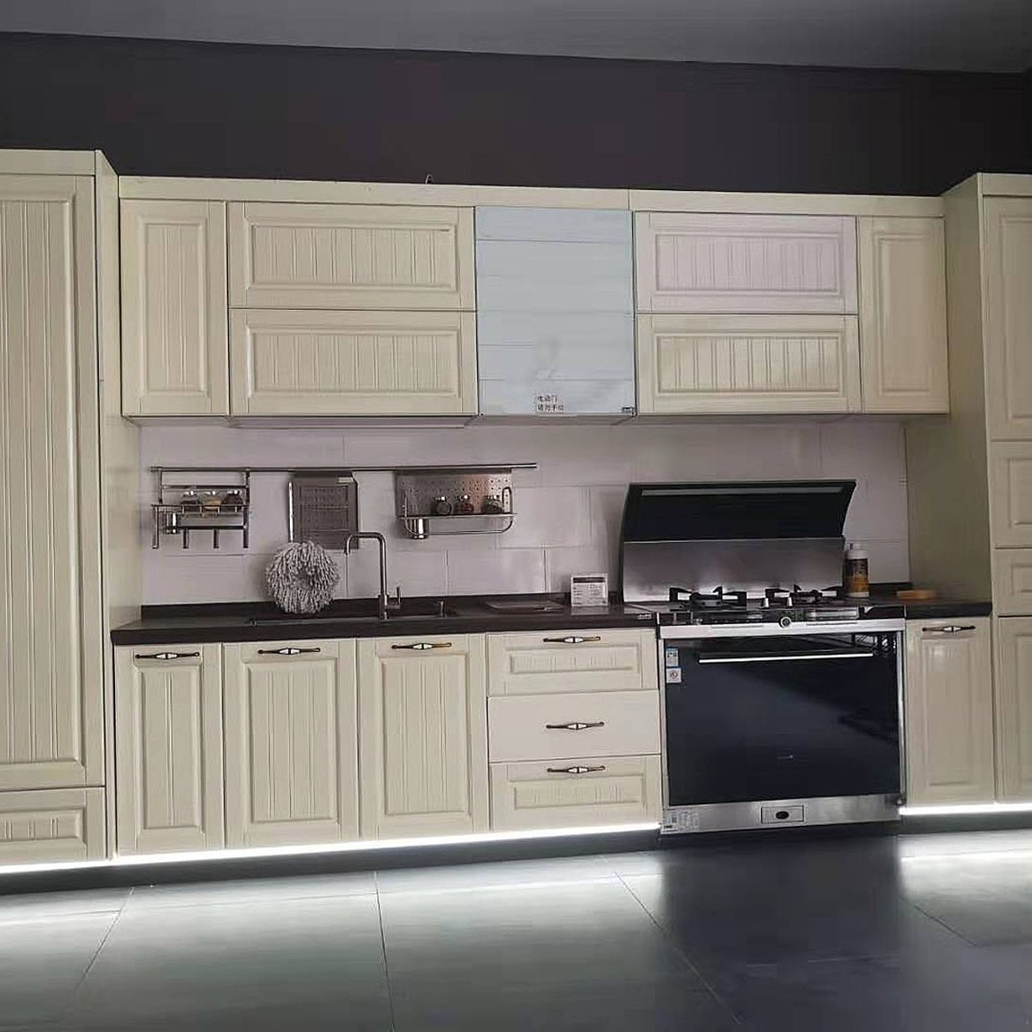 我是一个爱干净的人,所以设计尽量多一些储物柜,各种碗筷用具都可以放在柜子里,表面看起来就很简单了。设计踢脚线,主要是灯光可以让环境达到轻松的氛围,还可以防止垃圾进到柜子底下,以免不方便打扫。