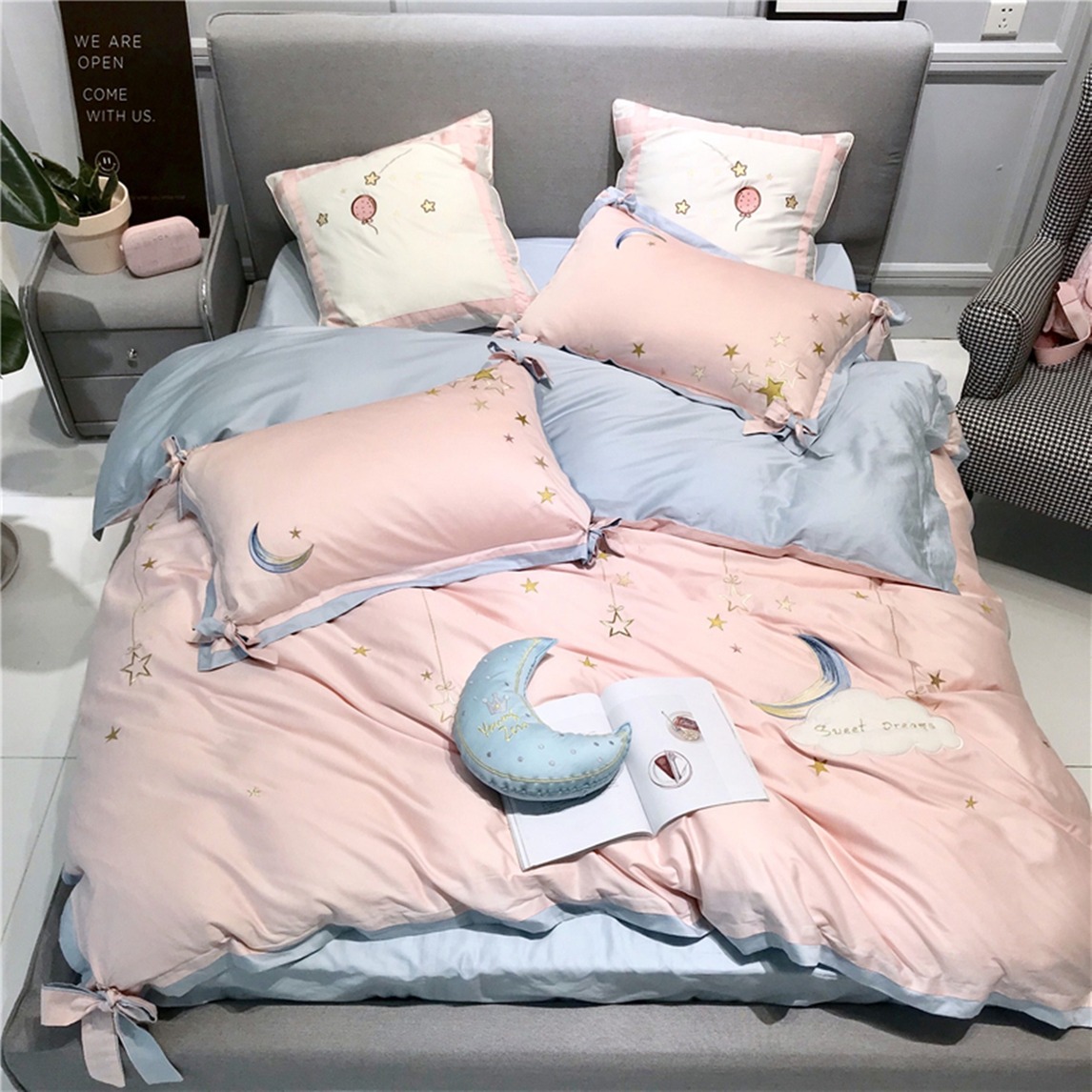 床品面料使用少女心爆棚的粉色,搭配上星星月亮图案点缀,视觉上具有强烈的美感,营造出浪漫的公主风卧房。