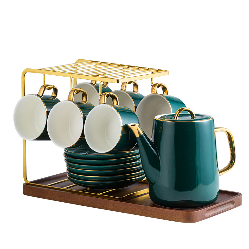 墨绿色的轻奢烫金茶具套装,流露出淡淡的复古风情,散发出迷人的优雅气质,跟朋友一起用下午茶的时候还会有轻奢质感。