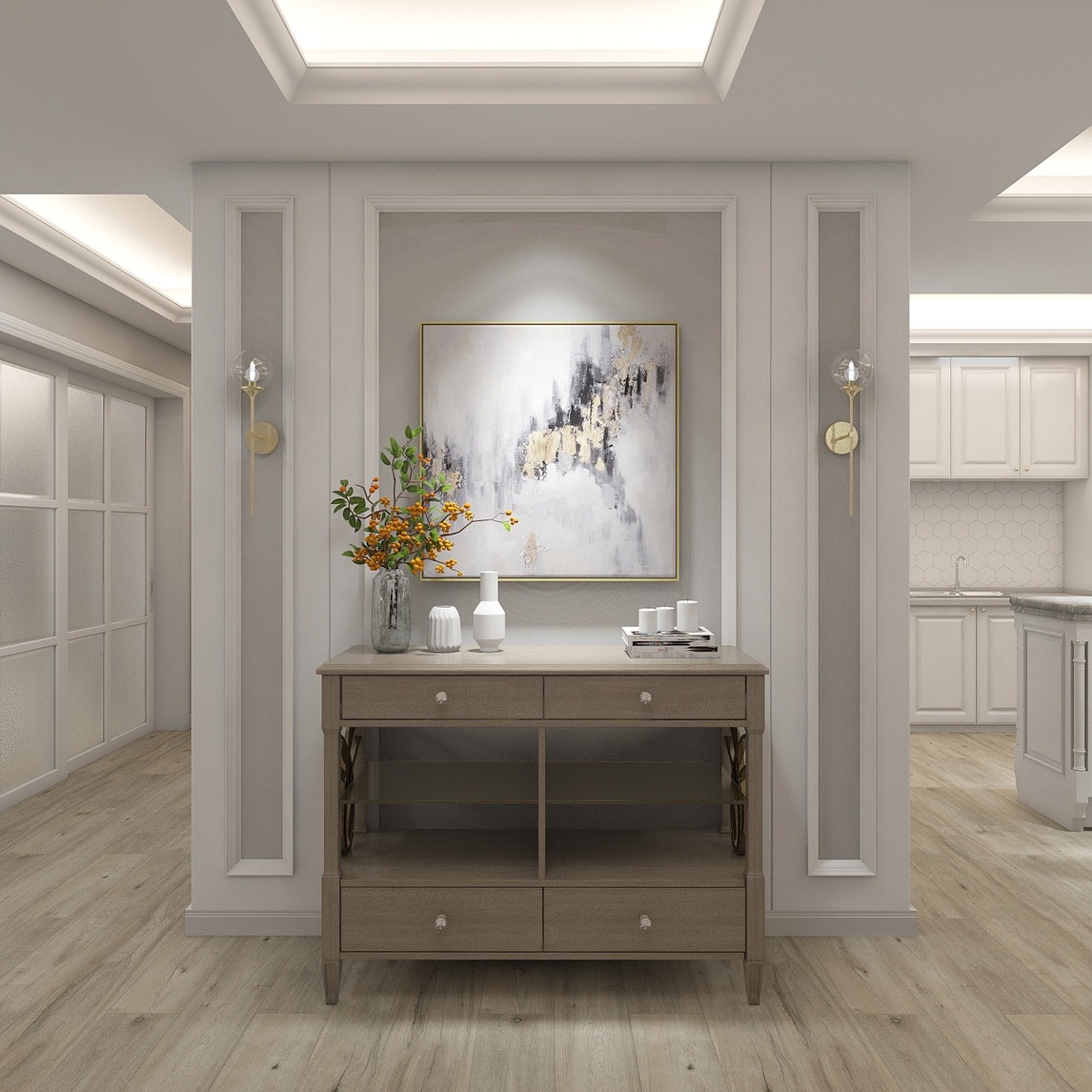 整个户型风格都是美式沉寂的色调风格营造,所以一进门的玄关用了比较正式的对称式背景设计,低饱和的木质材质在灰度与白色空间中游走自如,每天都恭敬的守候在门口,似乎在说,主人欢迎您每次的归来。