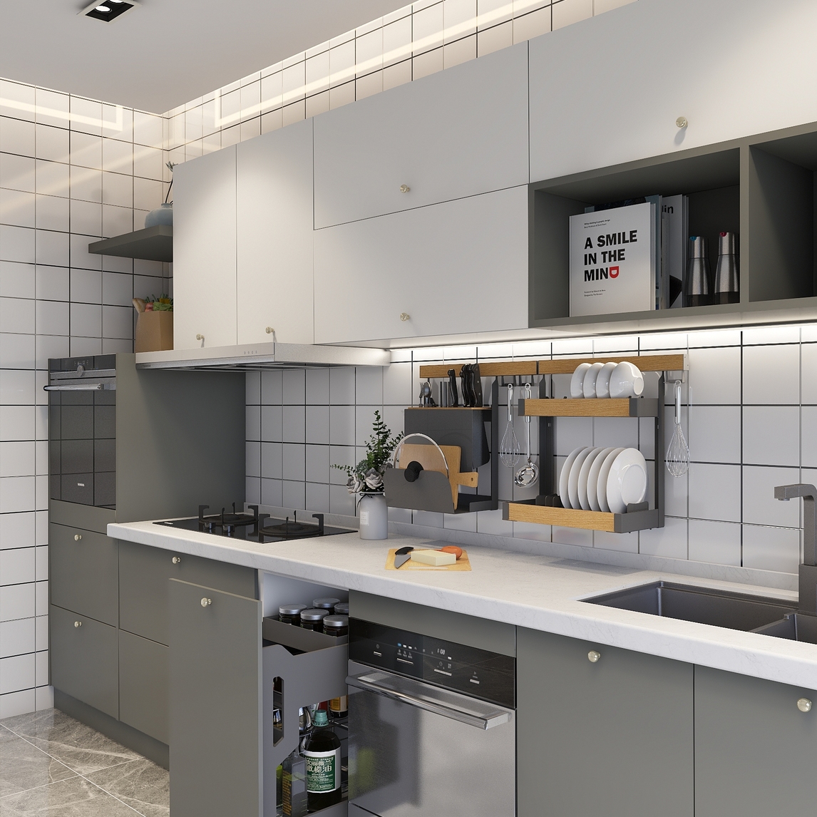 定制橱柜的时候功能分区很重要,橱柜台面做到上干净无杂物,易于清洁、有益健康。所以要将常用的调料、香料等杂物限制在一个专门的、方便使用范围之内摆放。