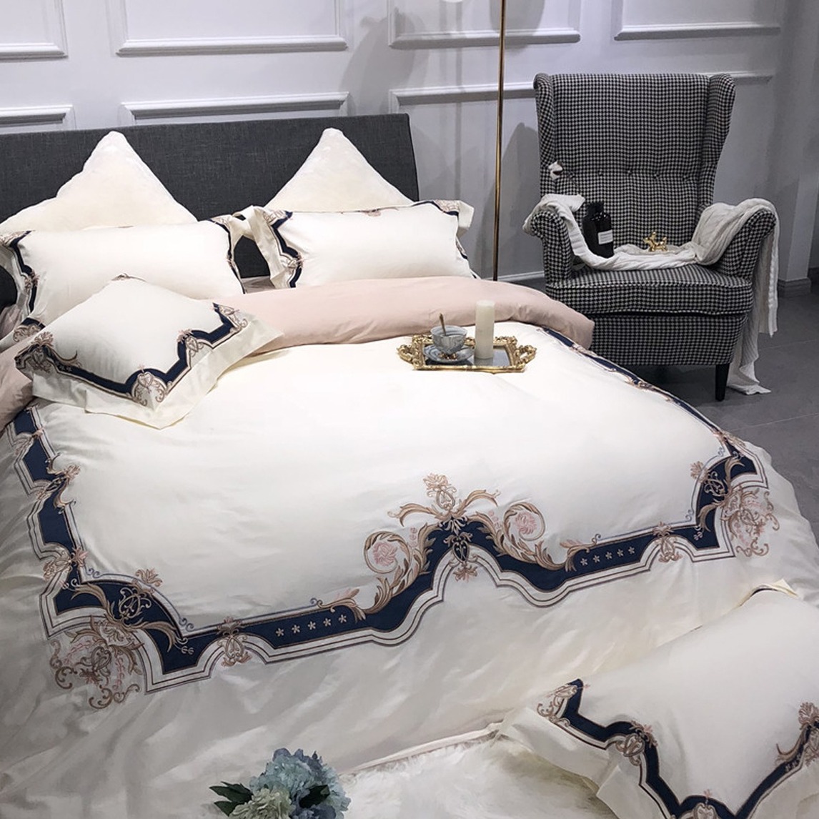 布料精选为100%棉的60S长绒棉,柔软舒适,摸起来手感超棒,而且被面表面有着精致的美式重工刺绣,绣花很细致,轻奢优雅。