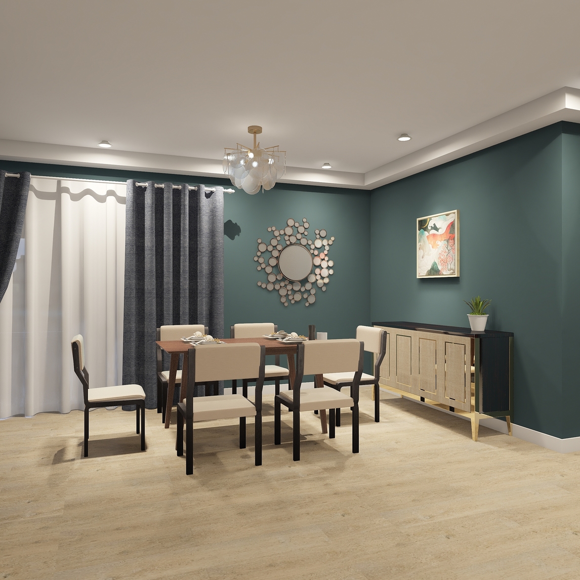 在本设计中,运用了不一样的装饰素材,将美式的餐桌椅配上轻奢风的边柜,用现代的装饰画做点缀,使整个空间玩转于各个风格之中。