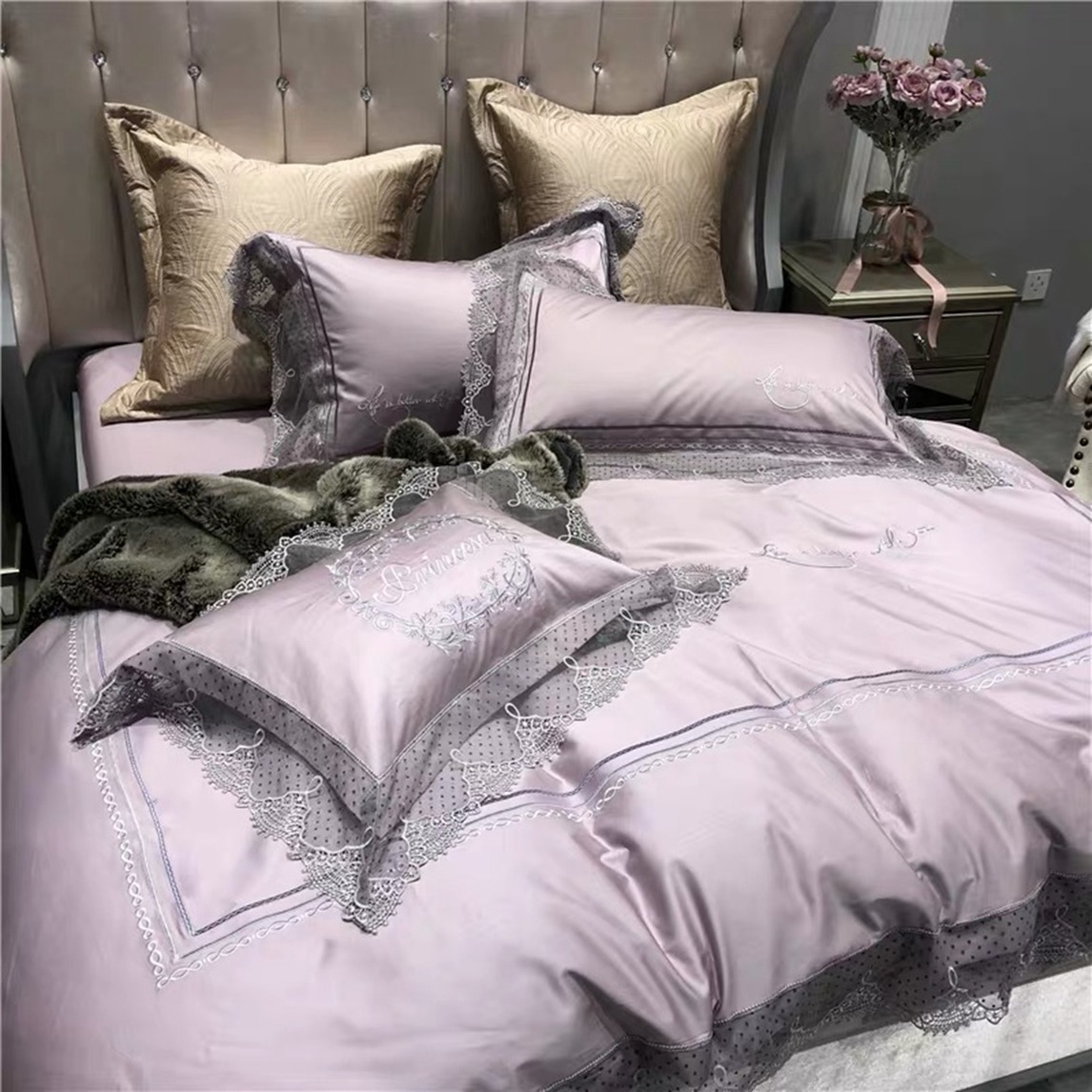 蕾丝公主刺绣贡缎四件套,采用优雅的紫色调设计,搭配上镂空的蕾丝花边设计,营造出浪漫的公主风卧室。精选亲肤长绒棉面料,贴身舒适。