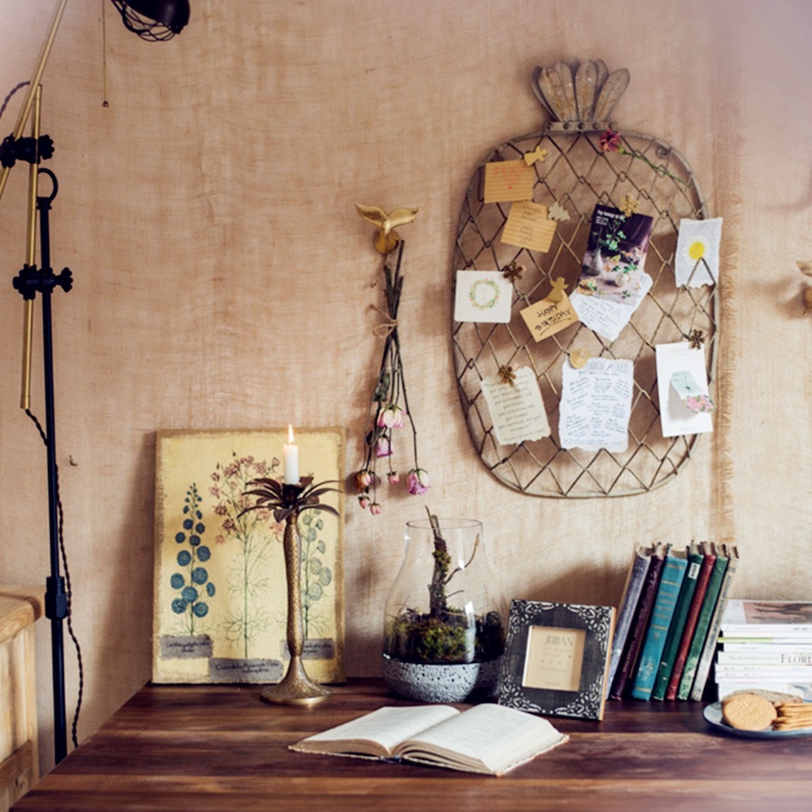我写字台对的着墙面装修的时候忘记做设计,住进去后就是光秃秃的墙面可难看了,我就让学设计的朋友帮我装饰了一下,瞬间不一样了,用菠萝造型的铁艺的架子,安装在墙面上,这上面可以夹一些留言条,很方便的,然后挂...展开
