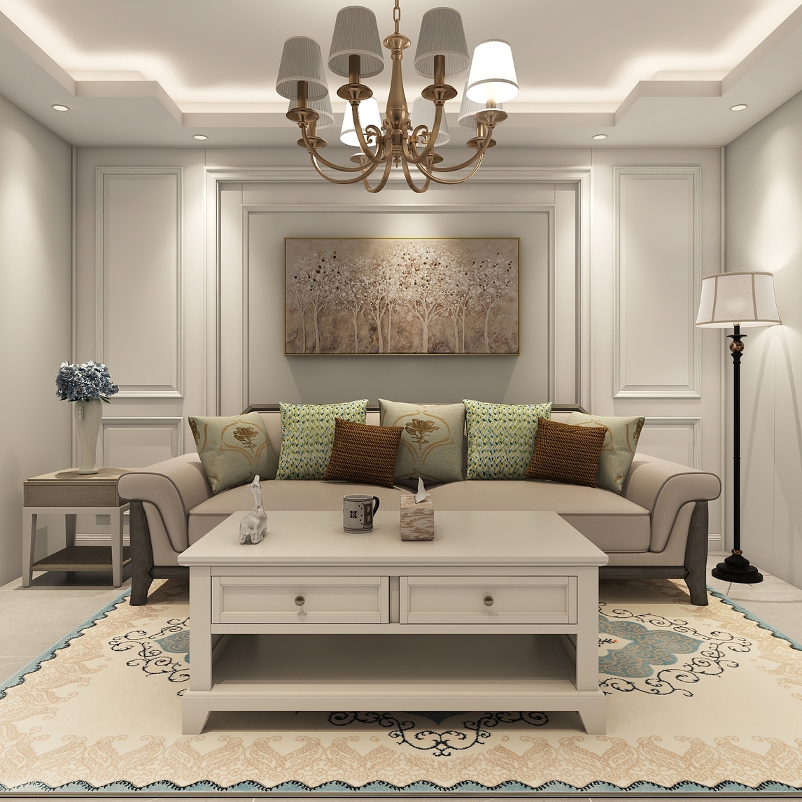 美式风格的客厅在带有石膏线的墙面加入了装饰画的点缀,为其增添了更多精致时尚美感,而搭配上一款简约布艺沙发与白色茶几,从而带来更多简洁大方感,另外辅以柔软地毯的点缀,还为这冷色调的空间增添了一抹温馨感觉...展开