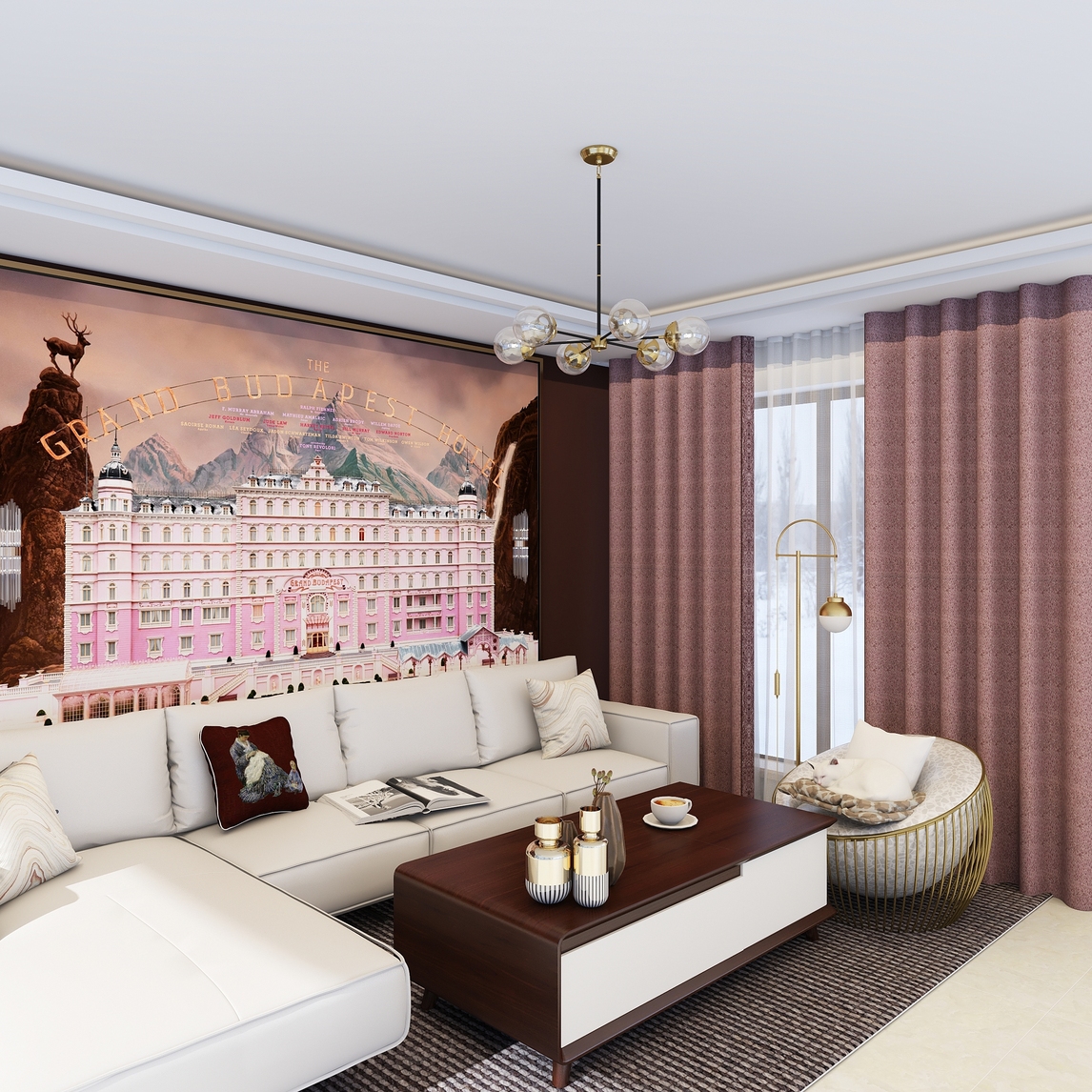 莫兰迪色系源自于意大利艺术家莫兰迪的油画作品,使用灰色调和中间色调来诠释温柔的美。本次家居配色我们选用茱萸粉系列壁画、窗帘、以及栗色茶几等去渲染整个空间,突出主人独一无二,不随波逐流的高级品味。