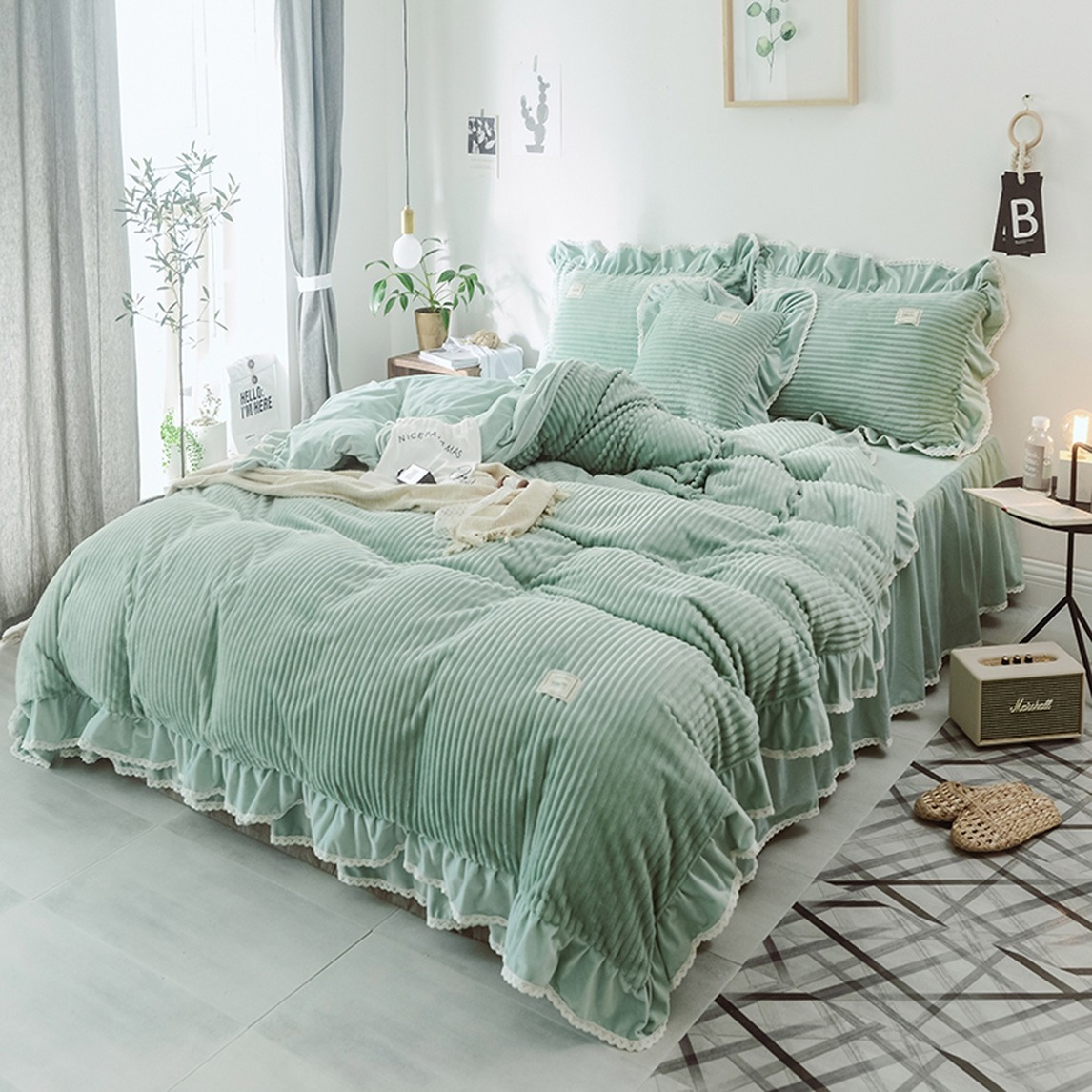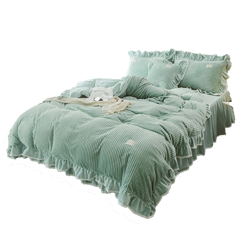 兔兔绒加厚保暖四件套,纤维细长有韧性,蓬松质地细腻,荷叶边的设计,精美时尚惹人喜爱,床裙褶皱设计,起伏有致,看起来垂感更佳,增添公主浪漫气息。