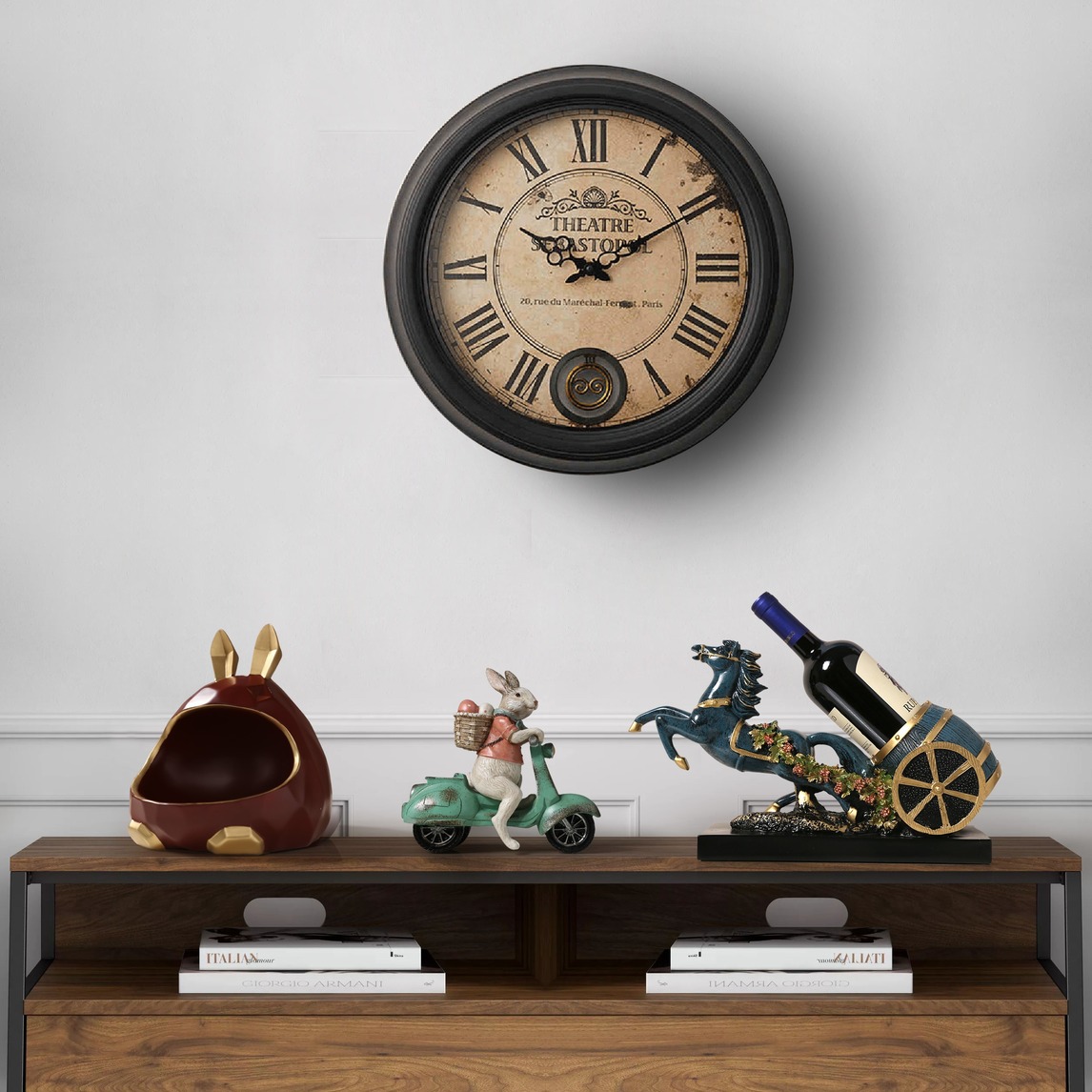 复古风的客厅,有些人会觉得不好装饰,有个小妙招,在最显眼的那面墙上挂上一个美观且又复古的挂钟,桌面上放几个小摆件,例如兔子摆件等等,放个收纳盘或者红酒架也是不错的选择,最关键的都要偏复古风的哦!