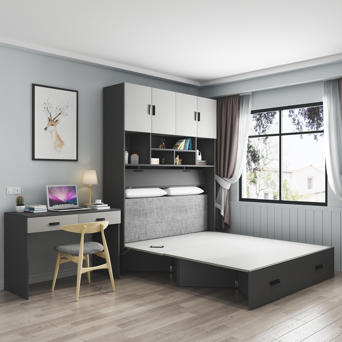 现在有一种设计是将书柜跟床设计在一起,这样可以一边学习,学习完就可以睡觉了。图中我们这款也是一样,并且还配备有书桌。书柜床一体的设计给我们节约了很多的空间,在我们工作学习乏累之时可以在隐形床可以稍作休...展开