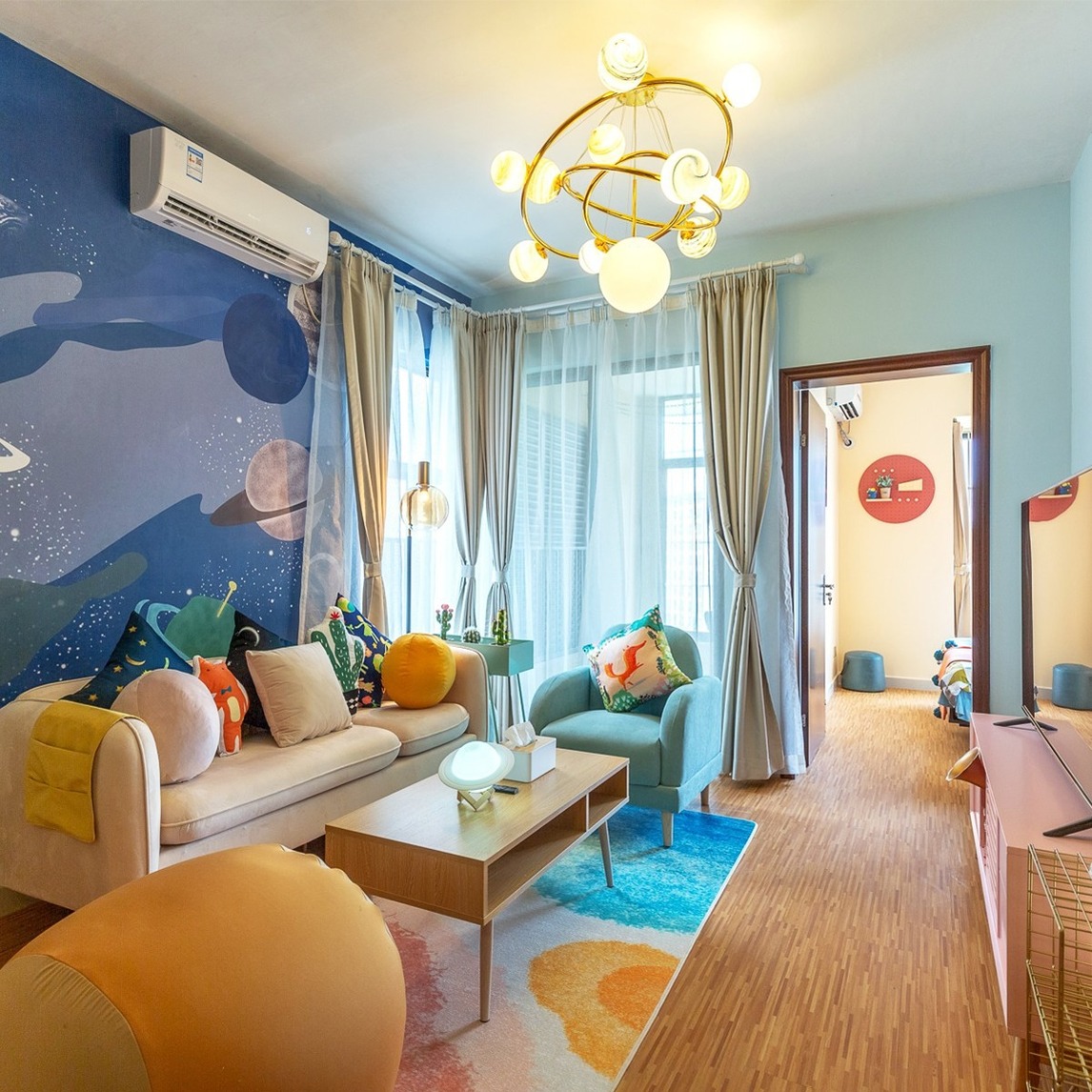 这个房间的主题应该是“遨游太空”,墙面的墙画是宇宙飞船和星系,充满着科幻色彩和童真童趣。同样的,天花板的吊灯也是宇宙的主题,一圈一圈的主体像是星系一般,在主体的圈上又有着各个行星,行星的设计也非常真实...展开