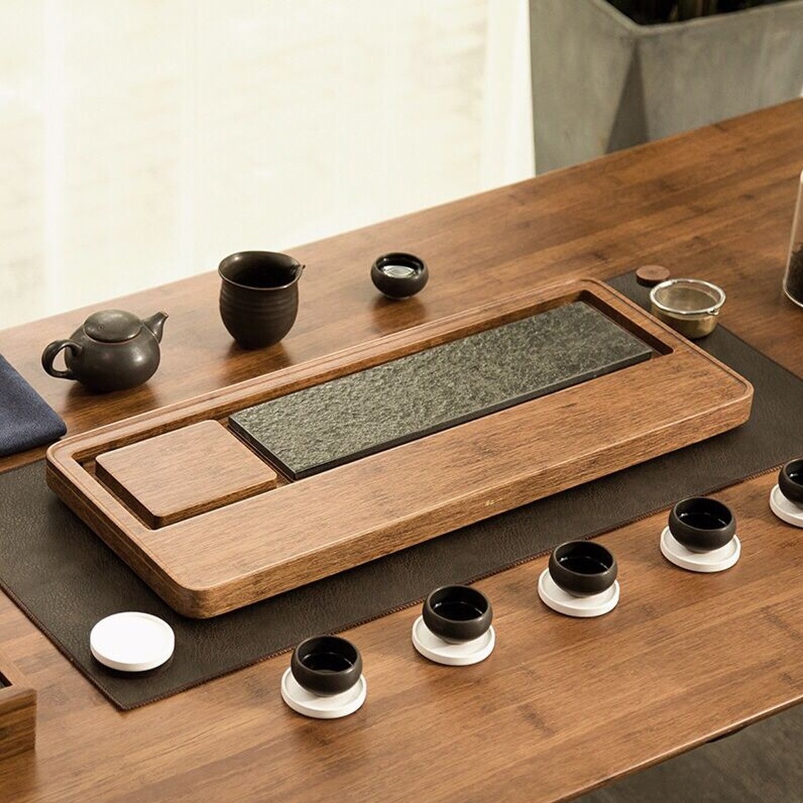 使用棕竹与乌金石组合打造的茶盘,保留天然纹理,其中棕竹密度高,硬度强,不易开裂变形。整板一体雕刻成型,更显精致感。