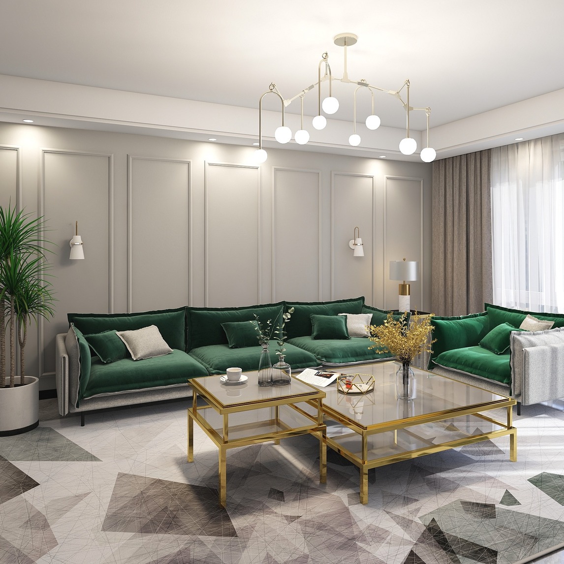 如果你觉得空间没有色彩,那就选个跳色沙发吧,其他一切从简。背景只需要简单的几条石膏线就能营造不一样的氛围。绿色搭配金色元素很时尚奥。