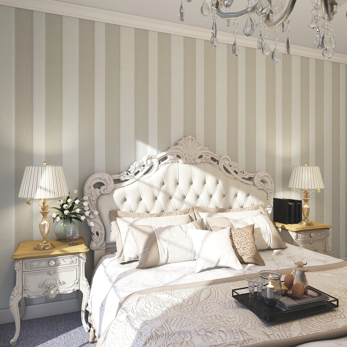 简单到繁杂、从整体到局部,精雕细琢,镶花刻金都给人一丝不苟的印象,棕白相间壁纸搭配带有西方复古图案饰线的家具,打造出简单实用又不失典雅的空间。