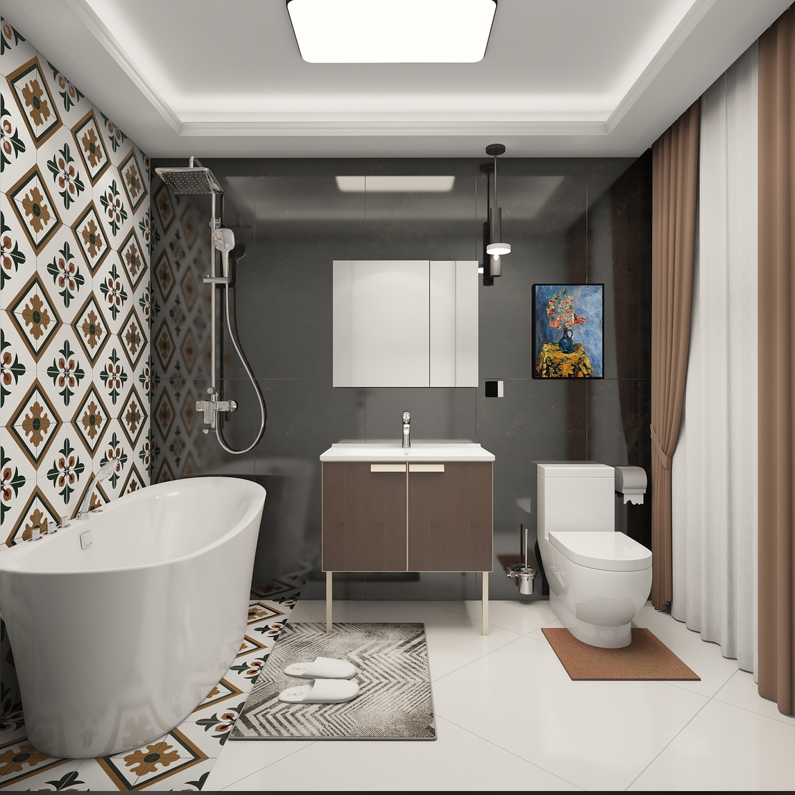 卫浴空间也可以有多种元素互相搭配,互相衬托,在一个有限的空间,显示出更多变化,更多乐趣,整个空间以浴室柜为主导的主色调,其他进行辅助,形成的空间氛围。