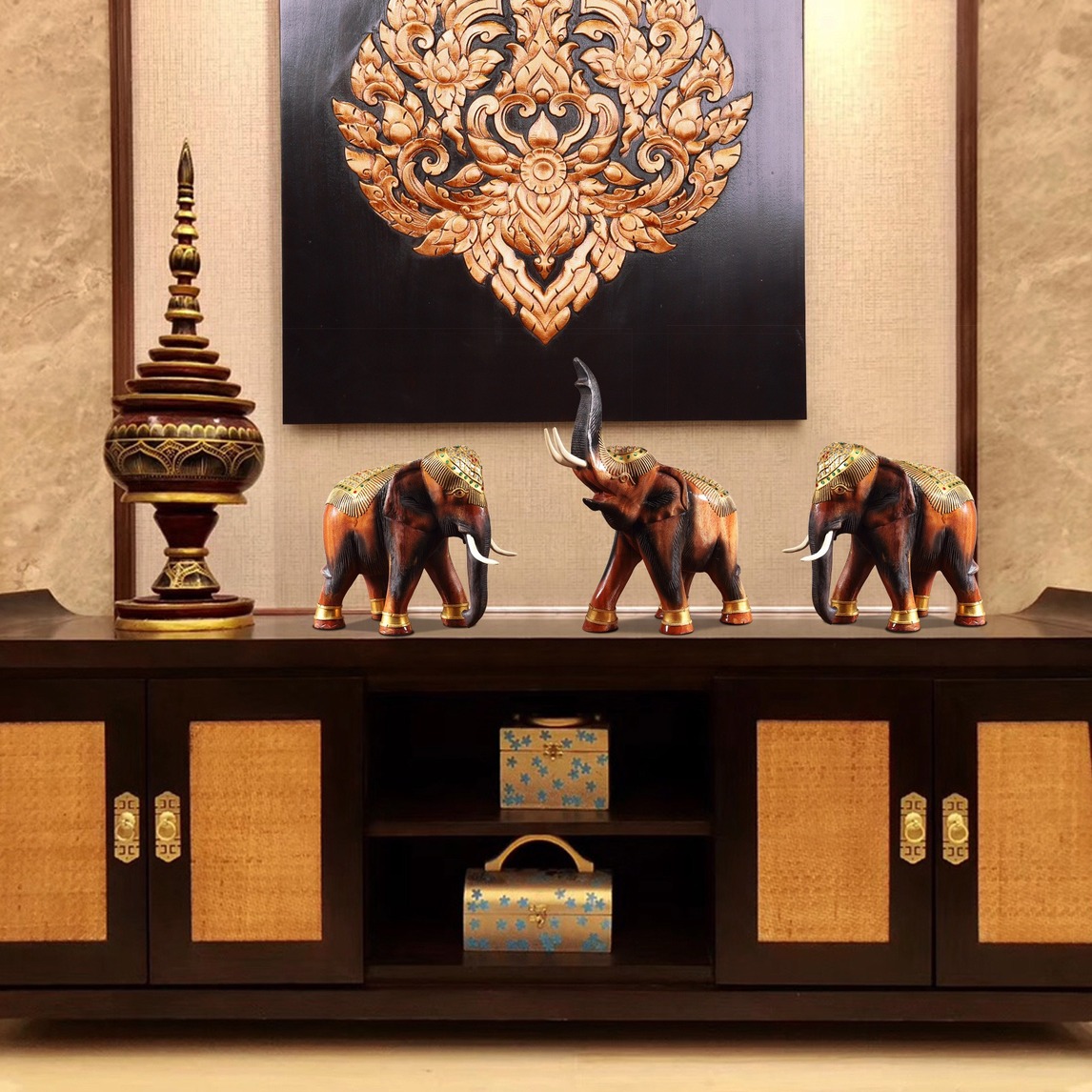 平日里看多了北欧、日式这样的装修风格,难免会有些视觉疲劳,今天初见这种充满东南亚异域风情的的客厅装修,简直太美了! 尤其是这款披金大象,精致又不失大气,让人一眼就爱上。其身披金箔、彩玻,华贵之气一览...展开