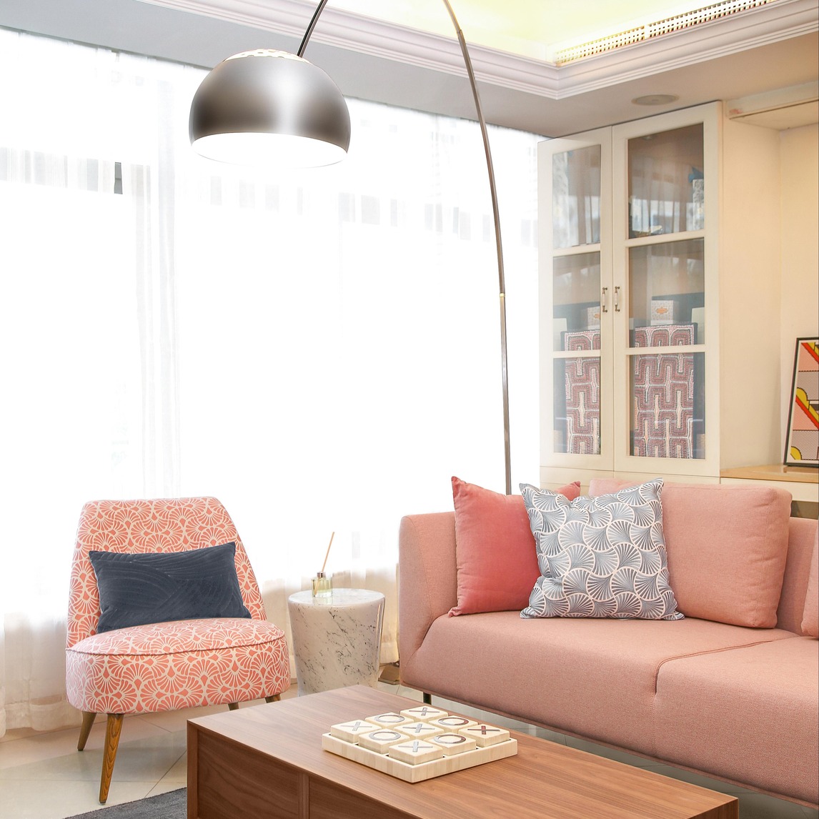 粉色沙发和粉色单人椅搭配出粉嫩场景,再加上木色茶几,靠垫套作为点缀,时尚又舒适,简单的搭配充满温馨。