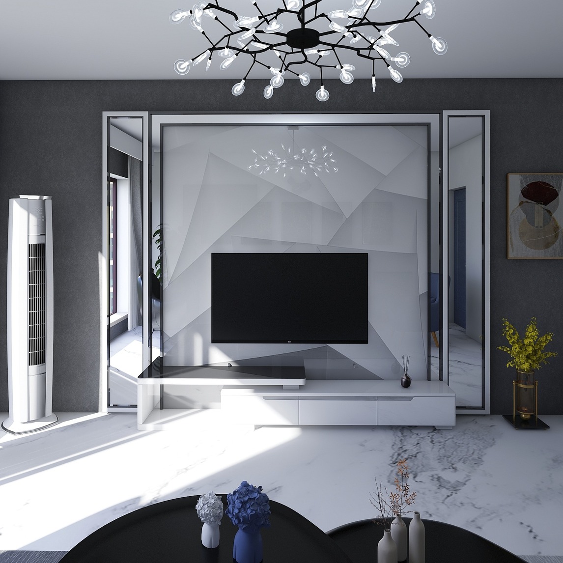 客厅属于会客区域,为了打造高冷气质,用了过冷镜作为电视墙,整体冷色调。符合当代年轻人宅人的理念。比较吸引人。