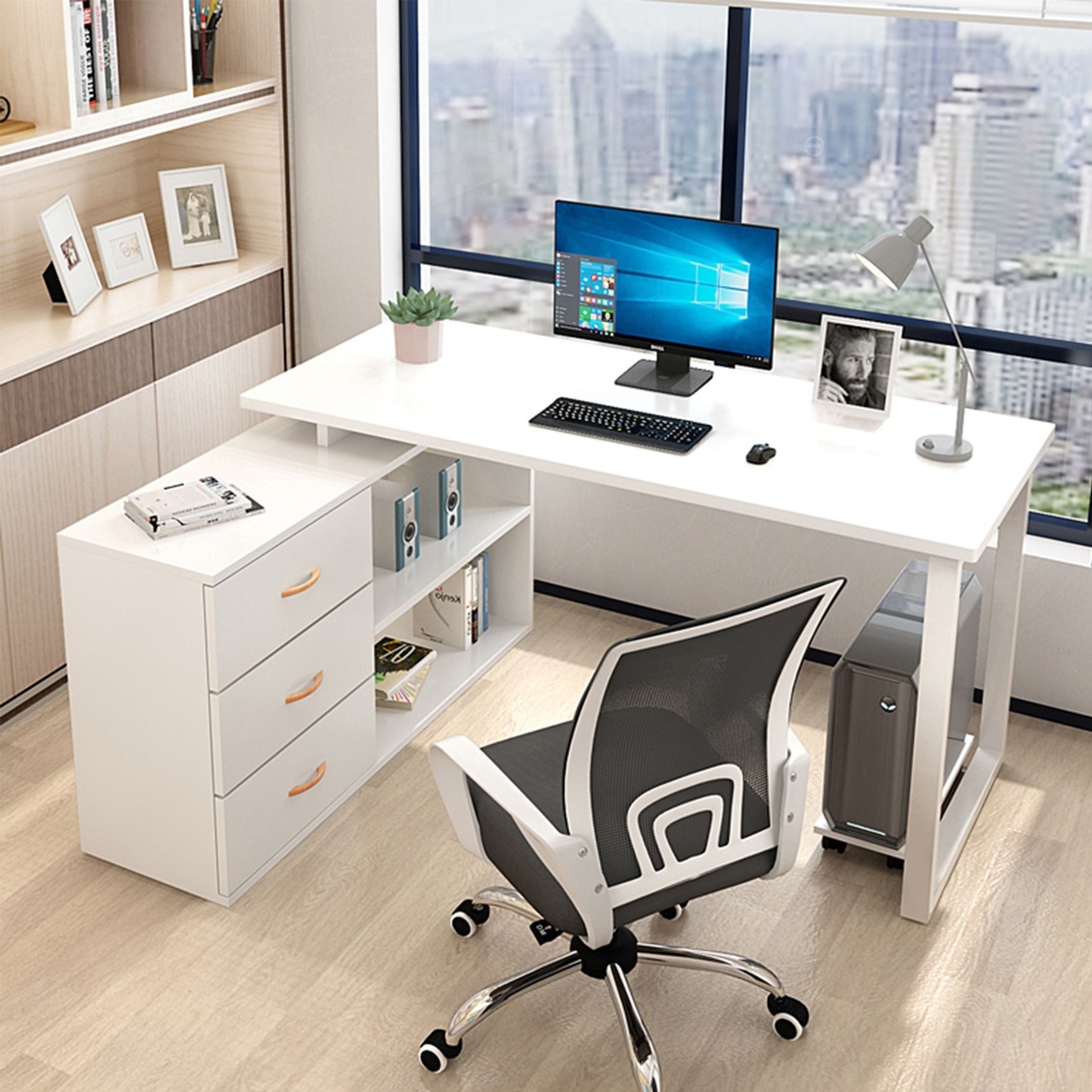 春风十里不如生活有你,简约电脑办公桌,转角设计,转角空间也能巧妙利用,很不错哦。 人性化设计,合理的空间分配,能够将物品收纳得整整齐齐。加厚桌面,轻松承受三个人的重量,经久耐用。
