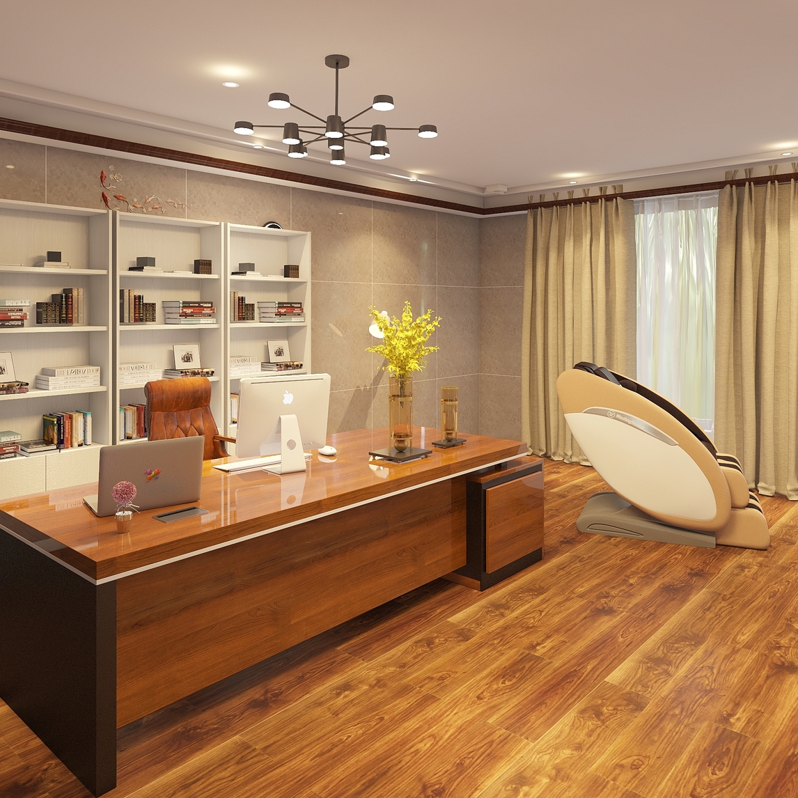 书房内展现有大书柜和大型的办公桌,檀木色的办公桌搭配木质地板,整体风格沉稳大气,衬托老板的大气气质。工作累了困了,可以坐上西屋按摩椅零重力下享受安逸的午睡。