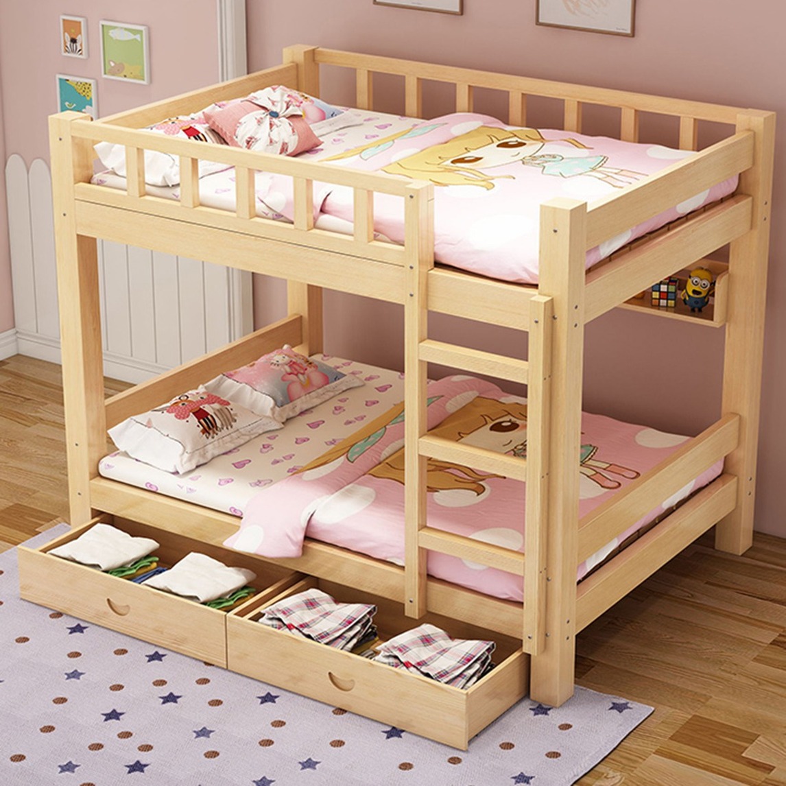 实木的双层儿童床,原木的框架加高护栏帮助儿童打造舒适加高的卧室空间,环保的材质一步到位,给予小孩玩乐的地方。