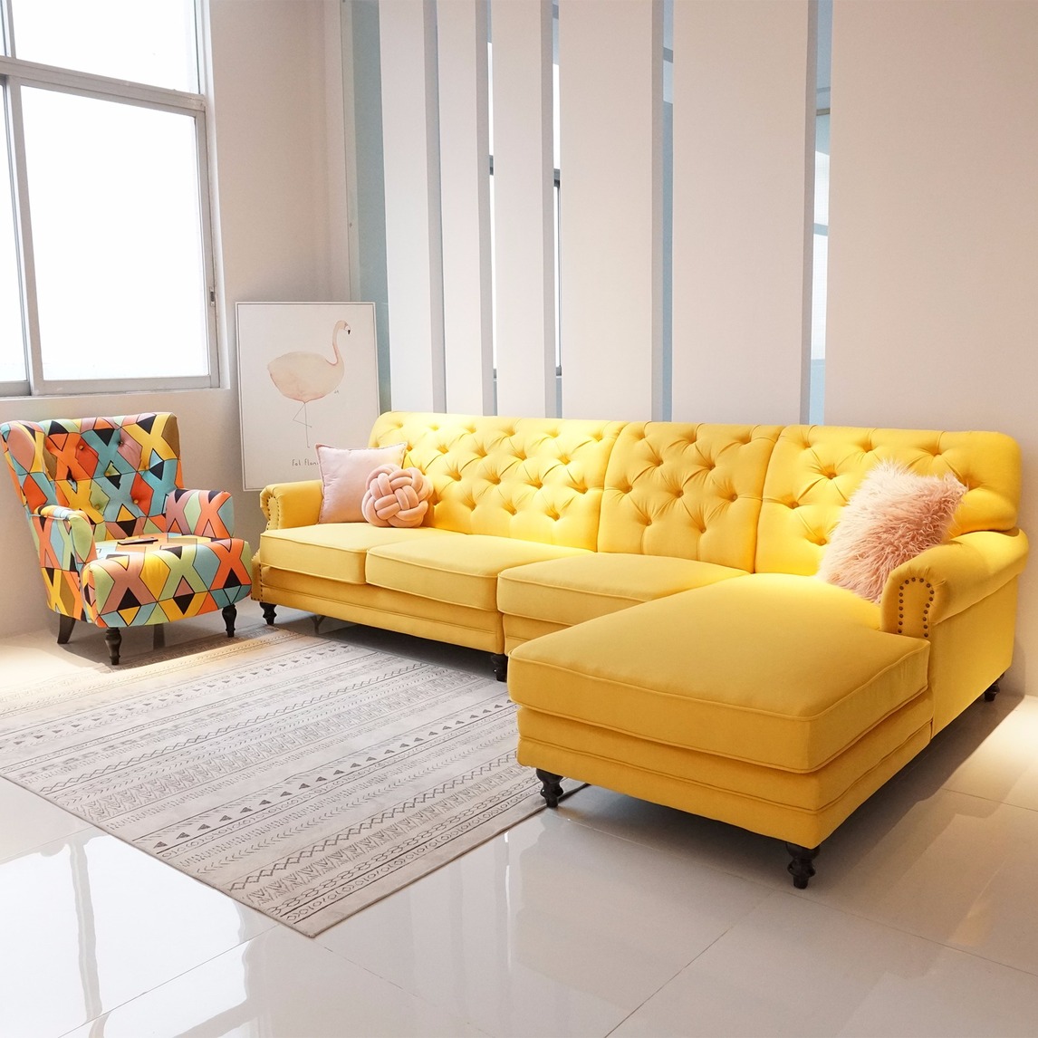 其实除了沙发是简美风格,其他的家居饰品我们配的都是北欧风的感觉!效果出来就是如图:摒弃传统的搭配方式,在色彩上做出不一样的感觉!