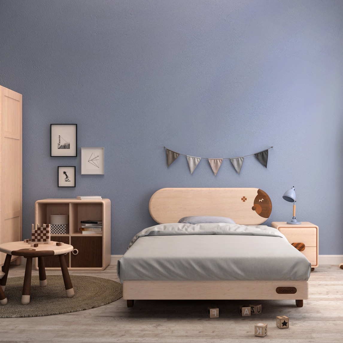 孩子热爱简单,因为那样会有更多的空间留给他自己思考。而我们总有精心考虑的细节在背后,小小的四个经典精灵书架,带着小领结的床头柜,有小熊守护的童床,总会让孩子轻易爱上。
