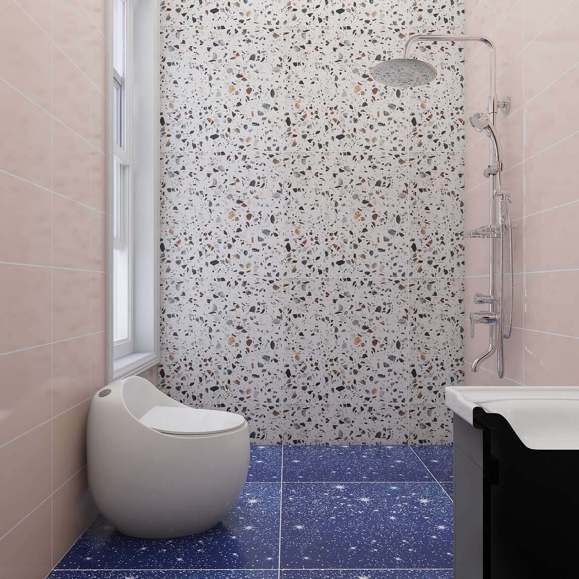 地面使用了星空水磨石,墙面用了水磨石和粉色瓷砖铺贴,搭配简约家具,整体视觉上统一,相互协调,相互搭配,自然顺畅