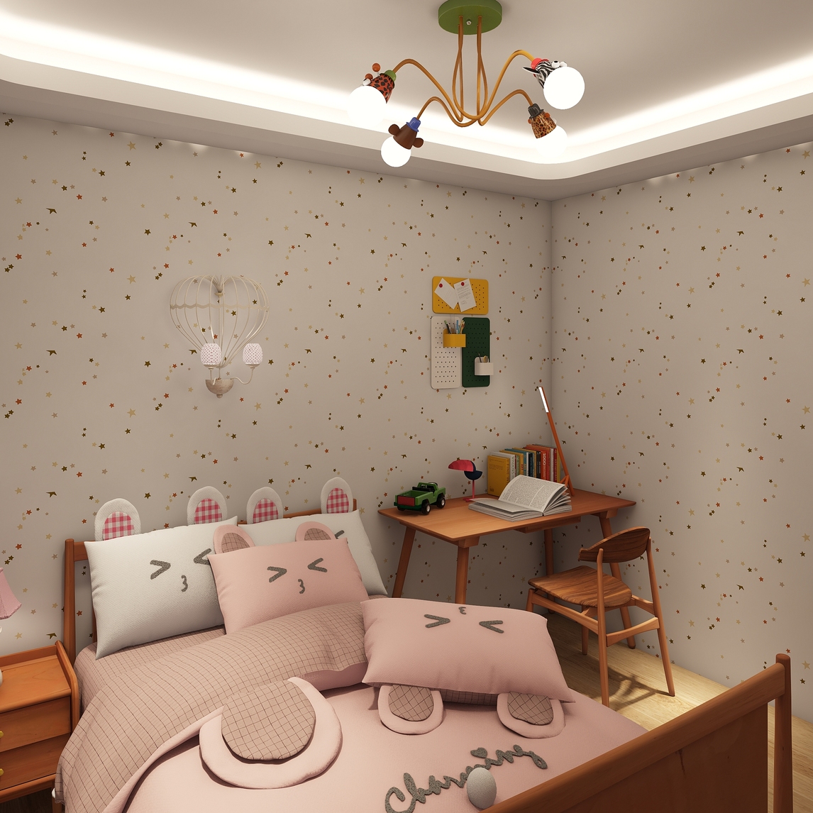 床旁边如果还有区域的话,摆一张小桌子,一张小椅子,一台护眼灯,便有一块专属孩子的学习区域,也便于孩子的自我成长