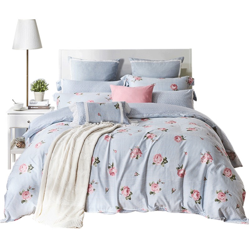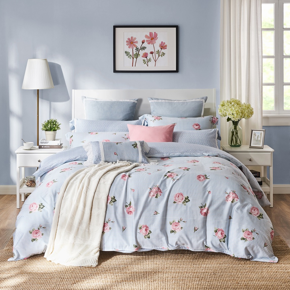 碎花小清新,回归巴黎的浪漫。枕套上白色的棉质爱心花边,满足少女的甜心梦。被套上的碎花印花,演绎法式浪漫里的不俗品位,搭配粉白蓝条,清雅脱俗,美翻卧室,能巧妙搭配多种家居风格。